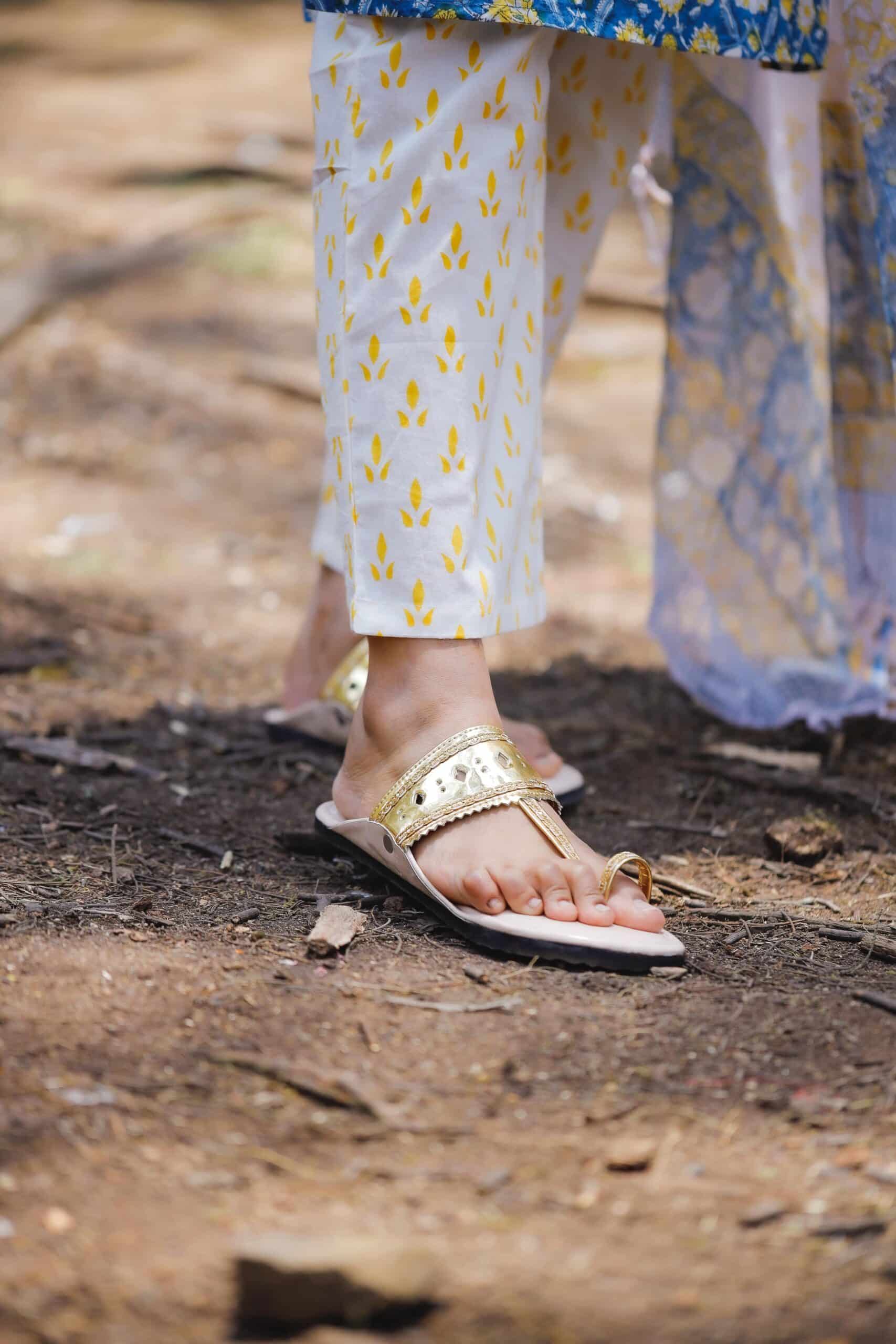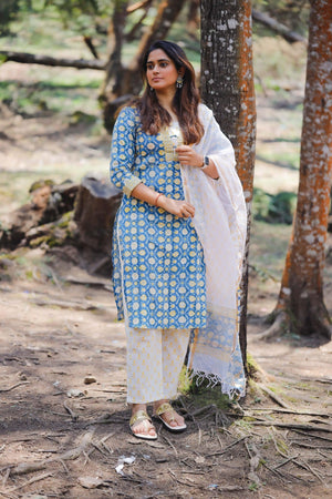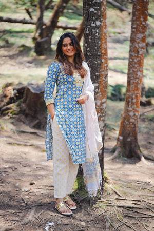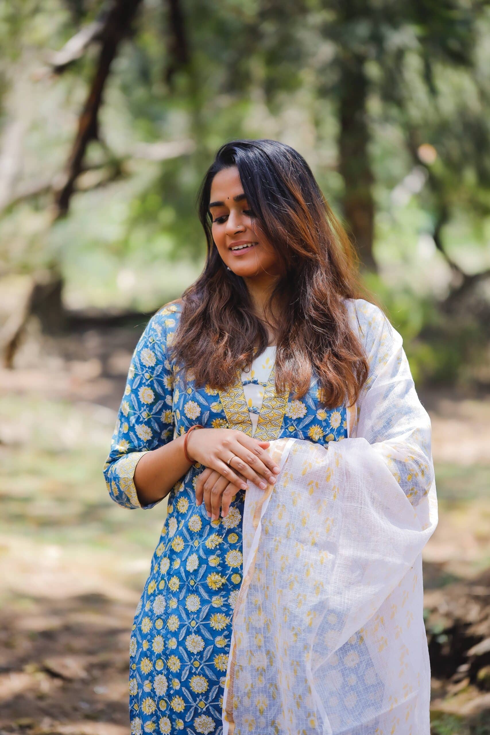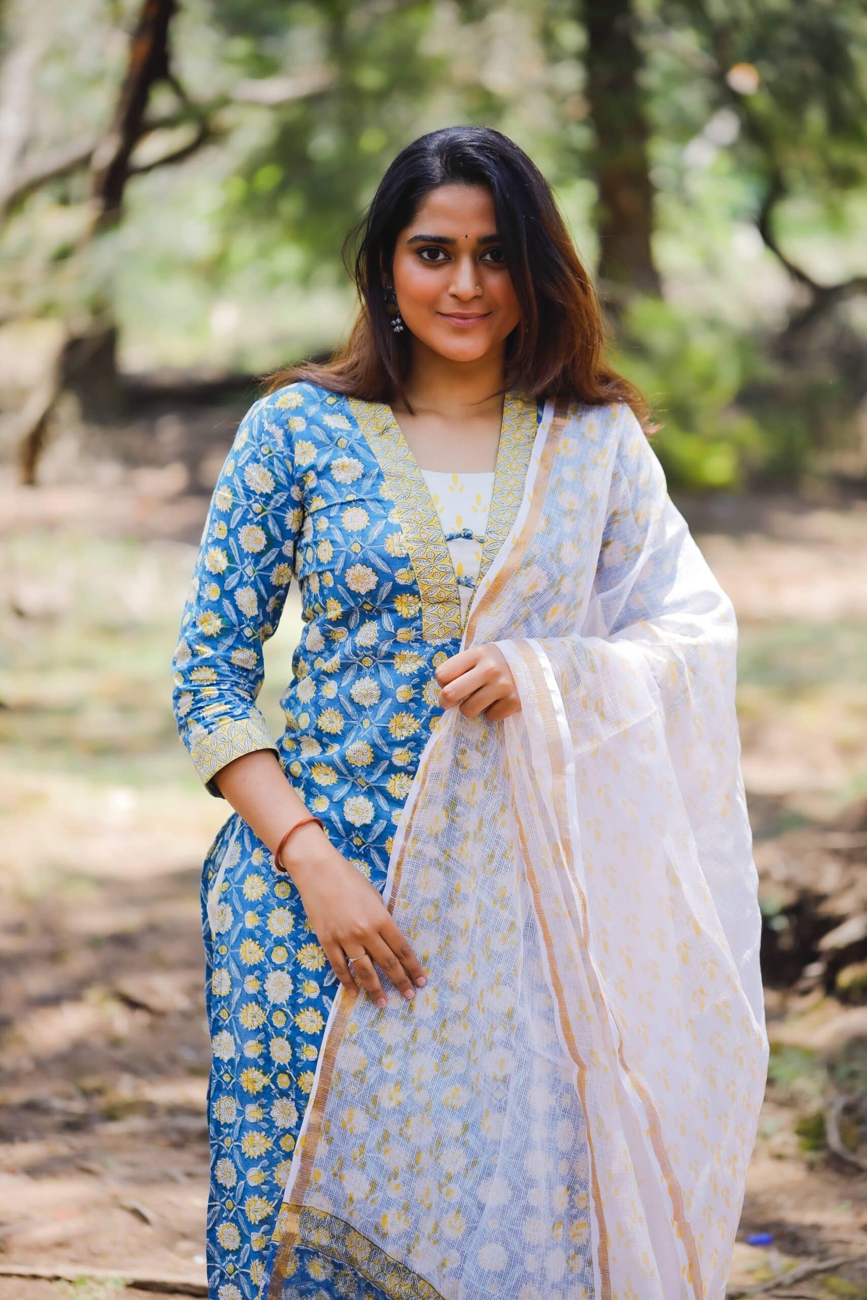 Comes with floral hand block printed trousers which has functional pockets and a matching kota doria hand block printed dupatta with tassels.