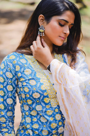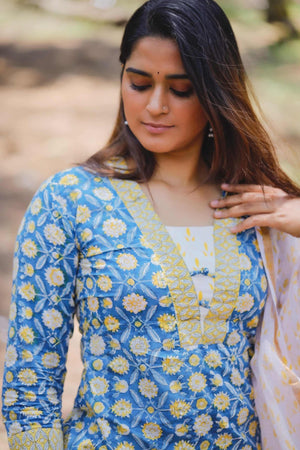 Floral hand block printed cotton kurta and a smart neck with loop detailing with 3/4th sleeves.