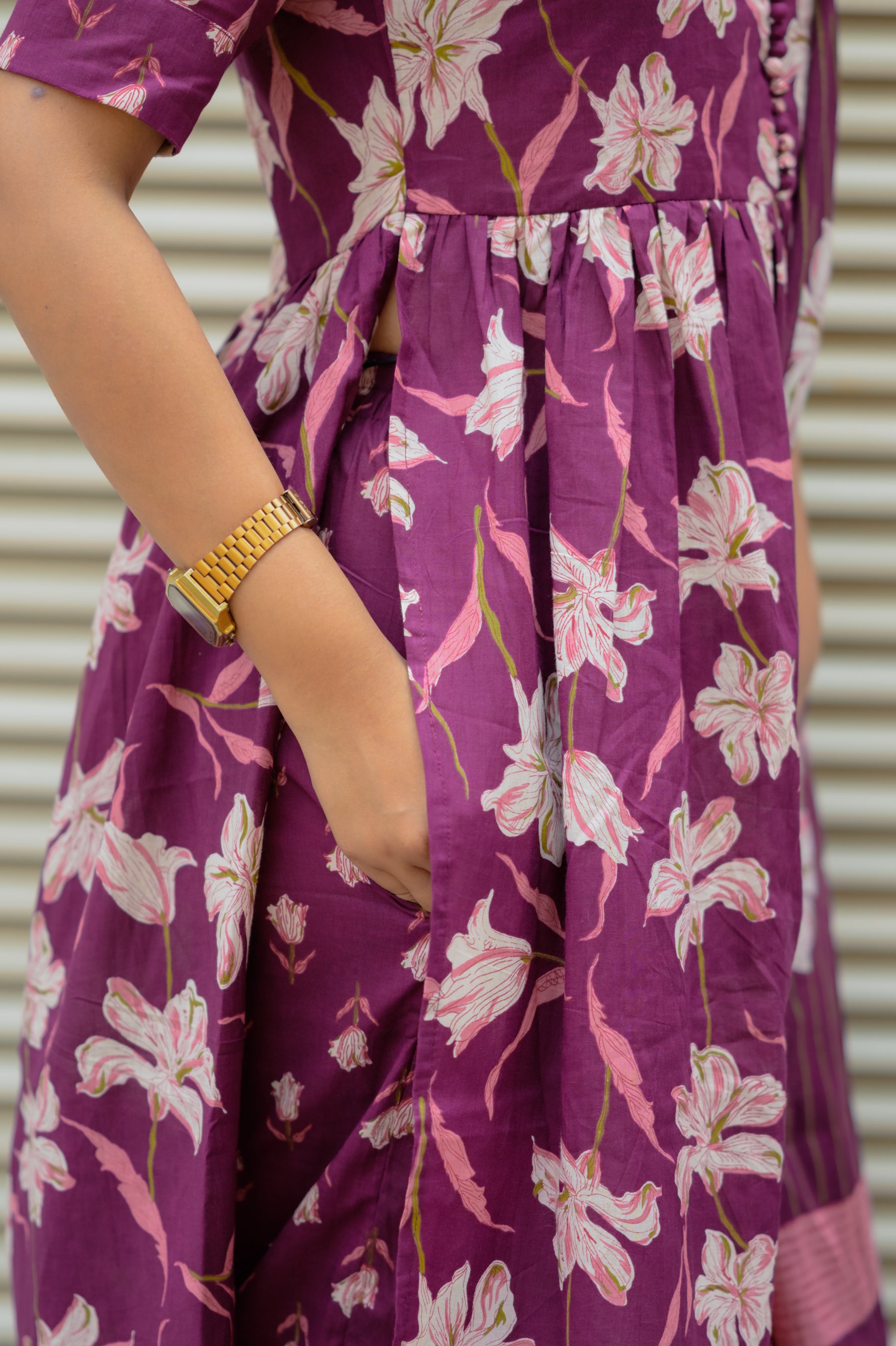 Pure organic cotton tulip hand block printed flared kali kurta with side slits, smart U neck yoke with potli buttons, 11 inch sleeves. Matching hand block printed cotton trousers with pockets and matching cotton dupatta with pink lace detailing.