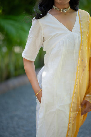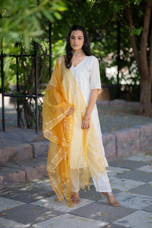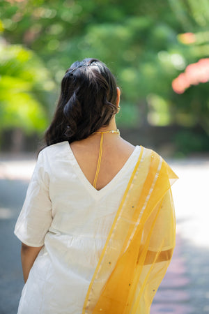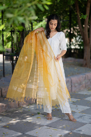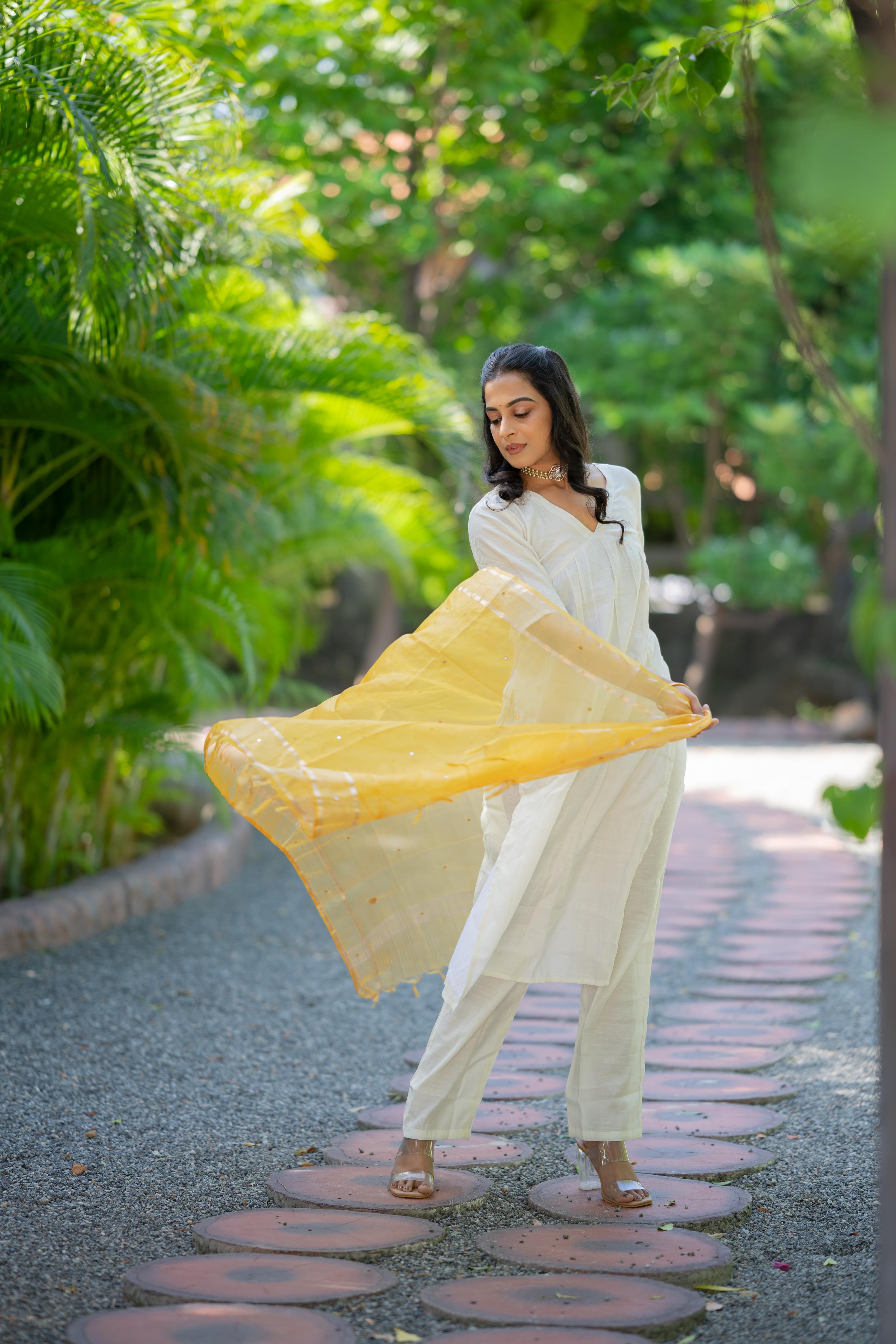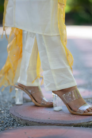 Aaradhitha - shimmer silk alia cut kurta set with organza silk dupatta with mirror work in cream & yellow