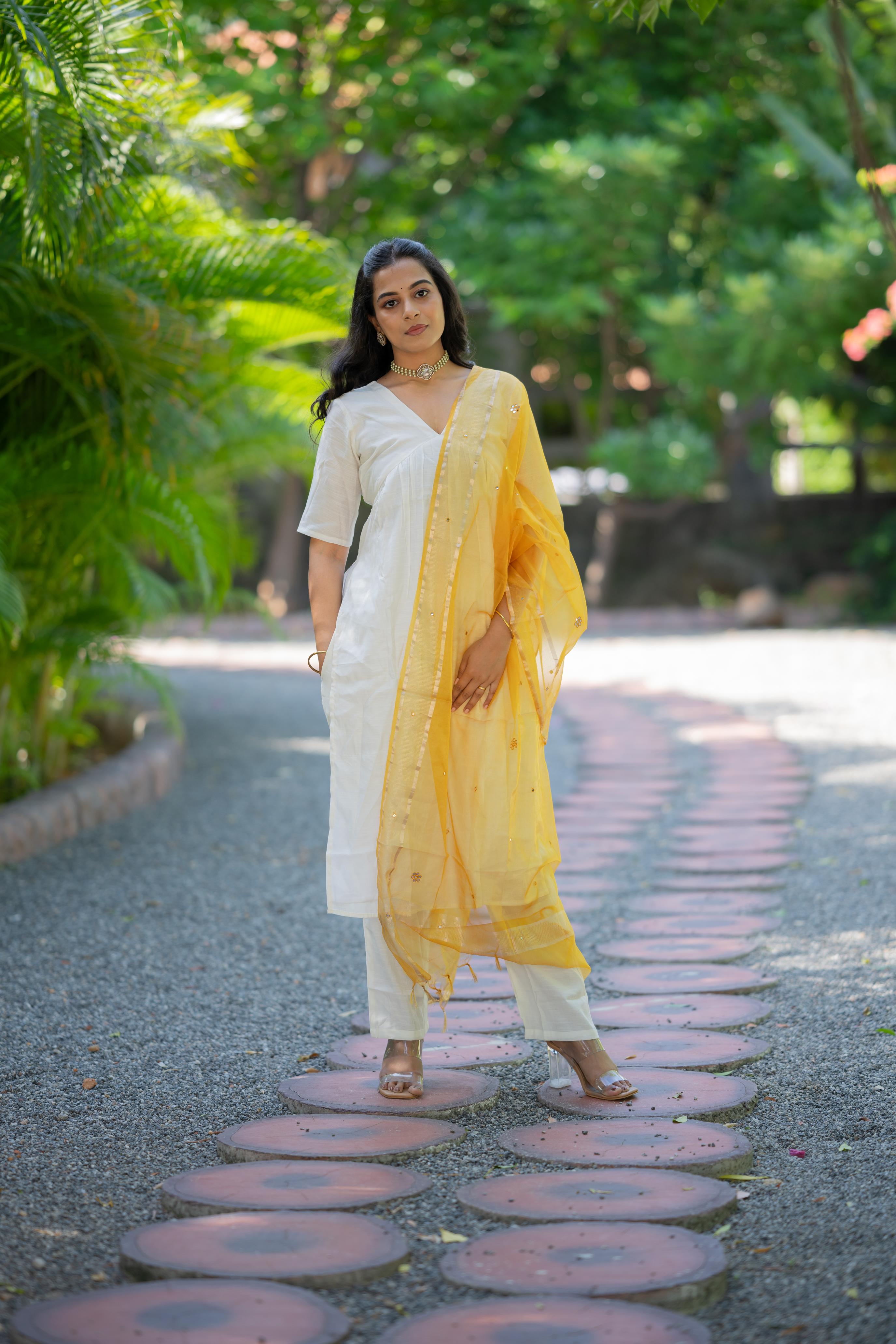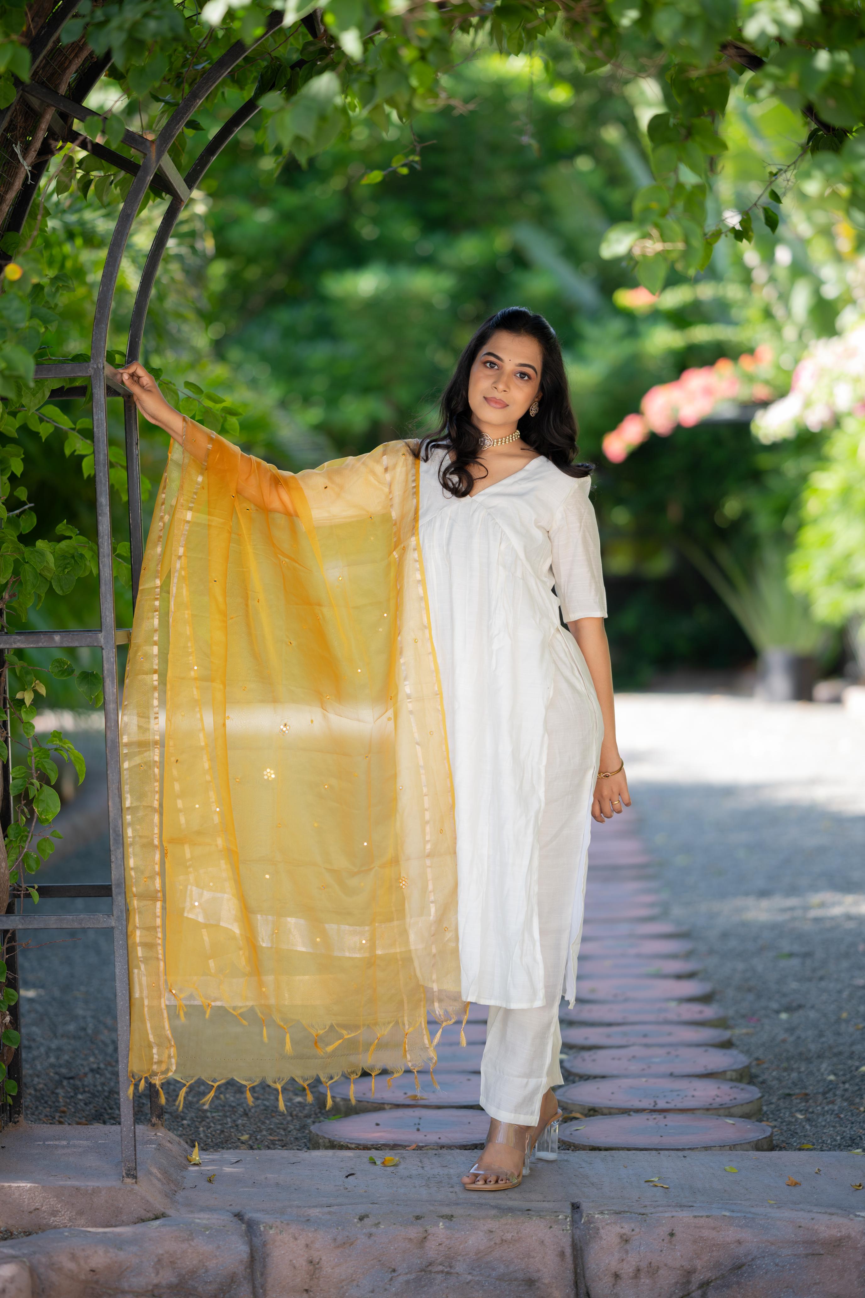 - Details - silk kurta set with alia cut, elbow sleeves with organza silk dupatta with mirror work. Kurta has lining attached, pants come with trousers.