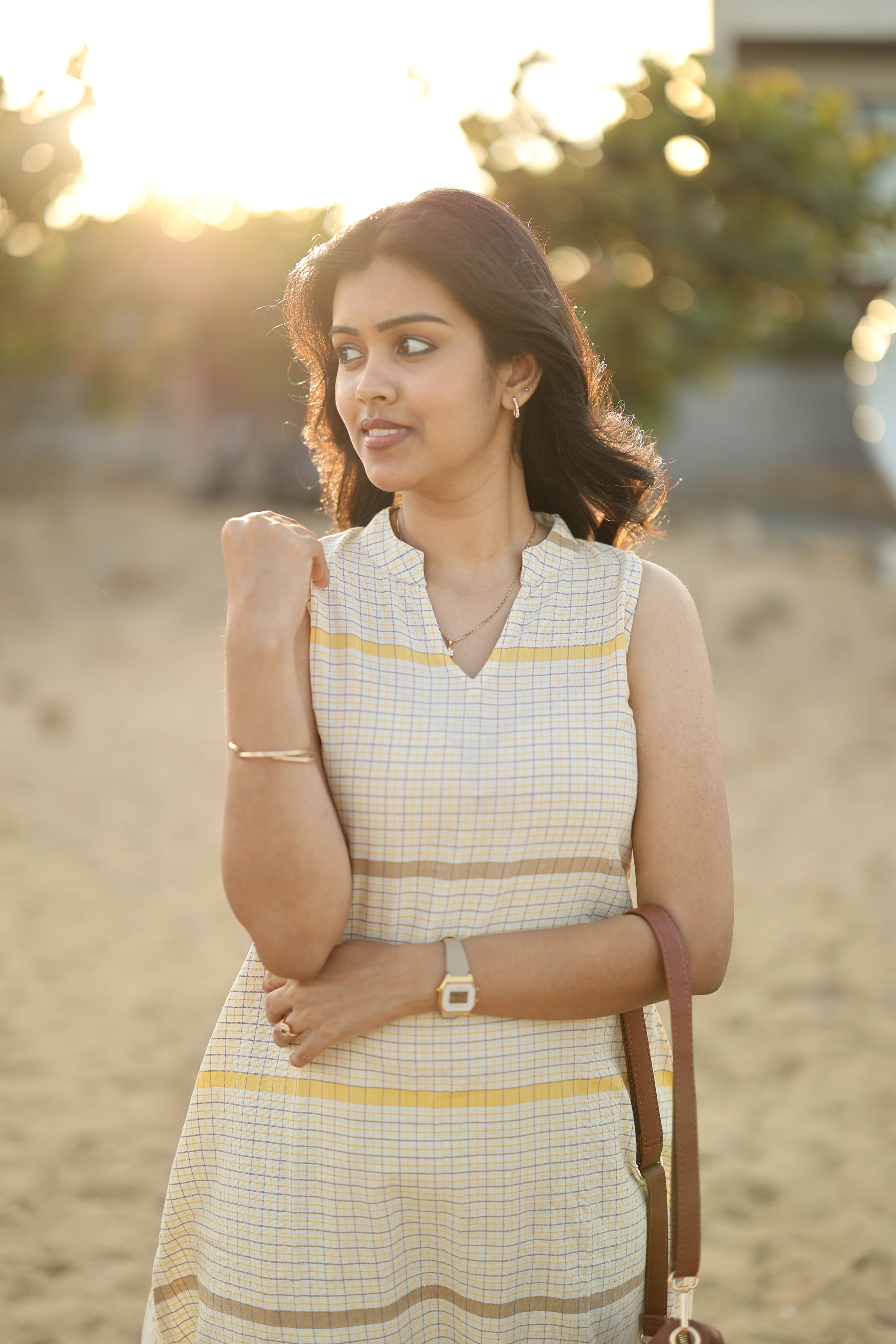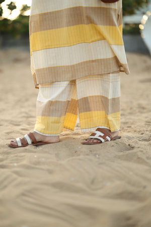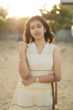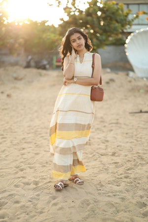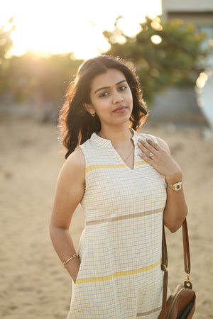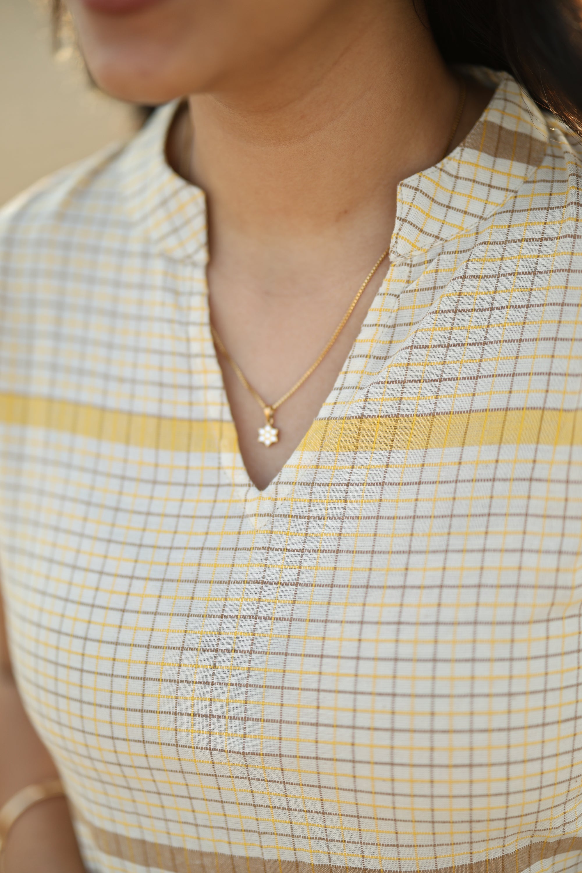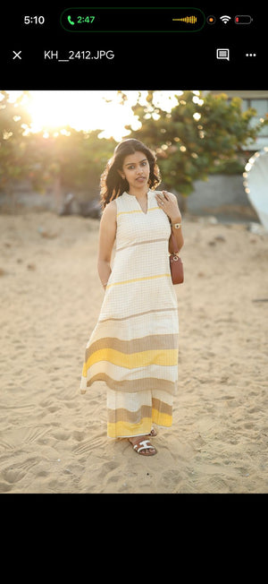 Handloom cotton checked A line halter neck kurta with functional pockets with smart collar.It has 11 inch sleeves inside the kurta and comes with matching handloom cotton palazzo pants. Perfect office / college wear.
