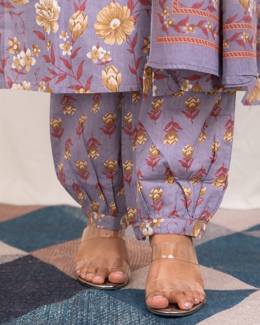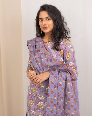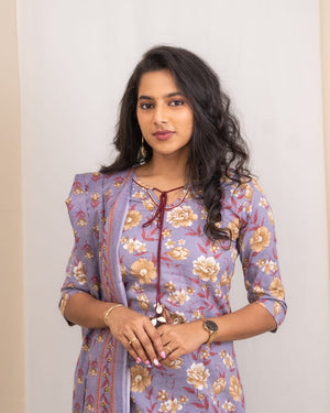 - Thistle purple floral hand block printed suit set with katha embroidered neckline with fancy shell tassels