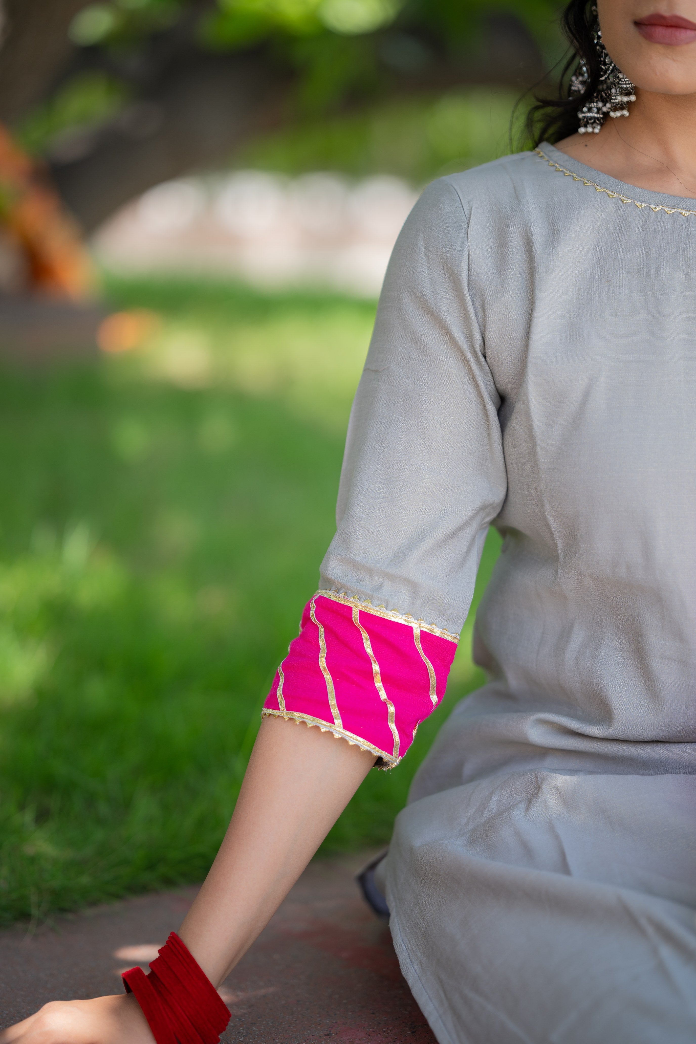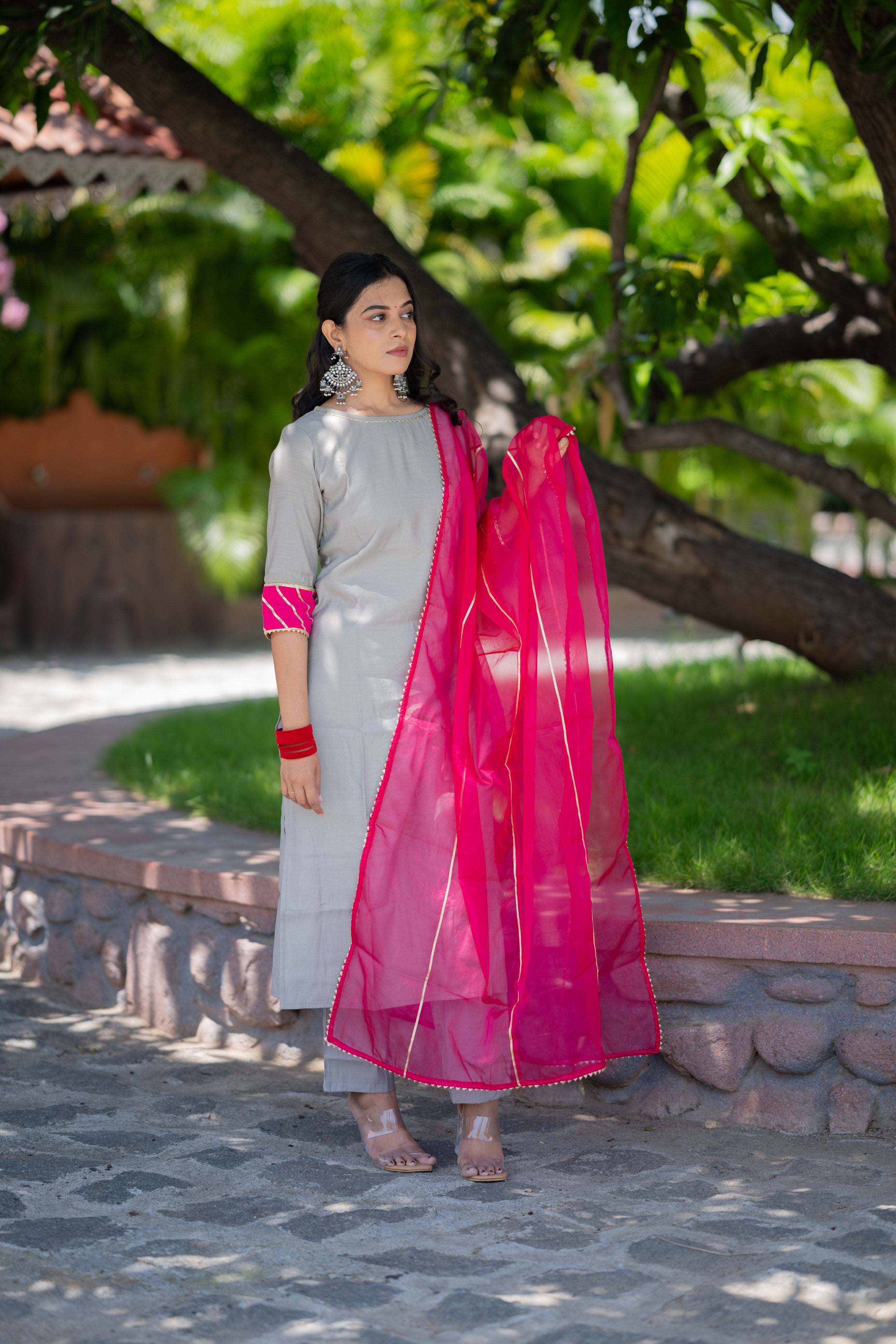 - Fabric - shimmer silk kurta set with organza dupatta ( lining attached ) with gota detailing