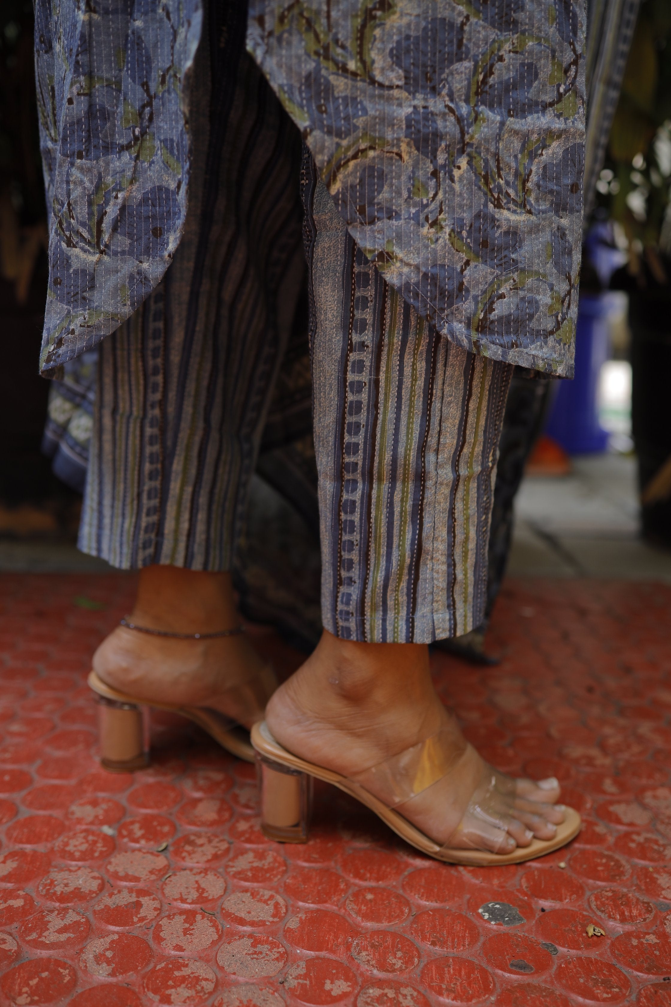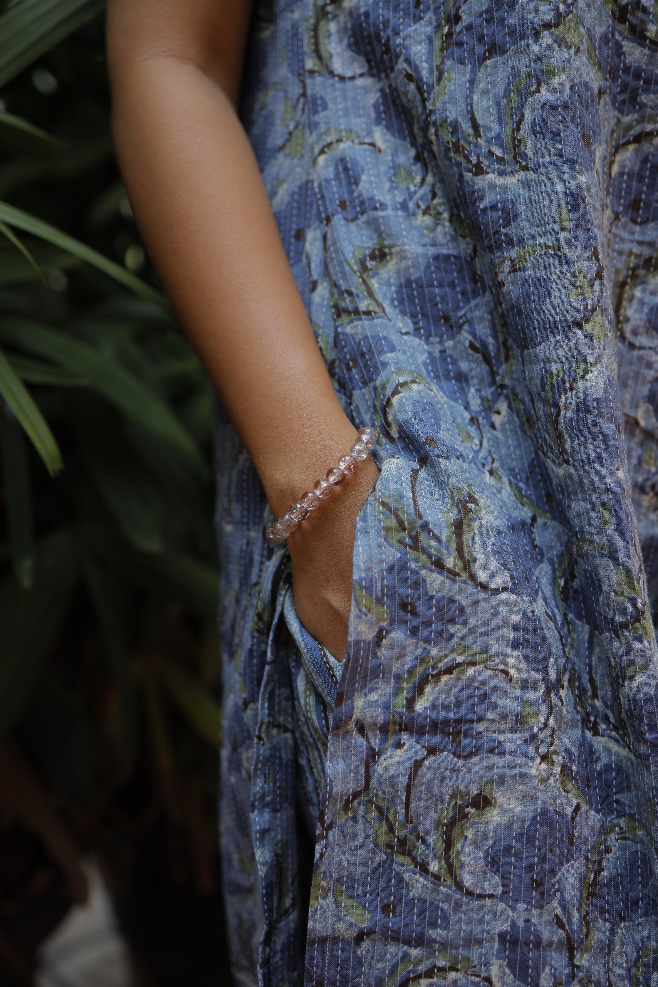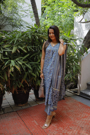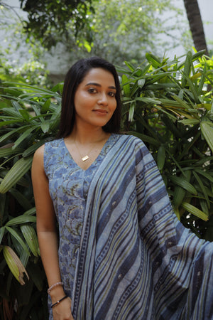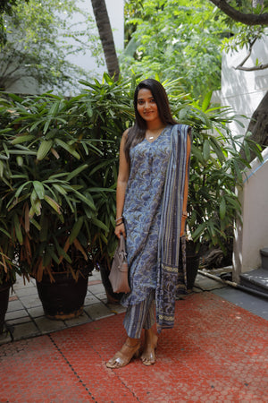 Hand block printed cotton suit in indigo, smart neck panel detailing, attached 11 inch sleeves inside the kurta if you don’t prefer sleeveless. Comes with matching hand block printed katha cotton trousers with functional pockets and matching indigo cotton dupatta.