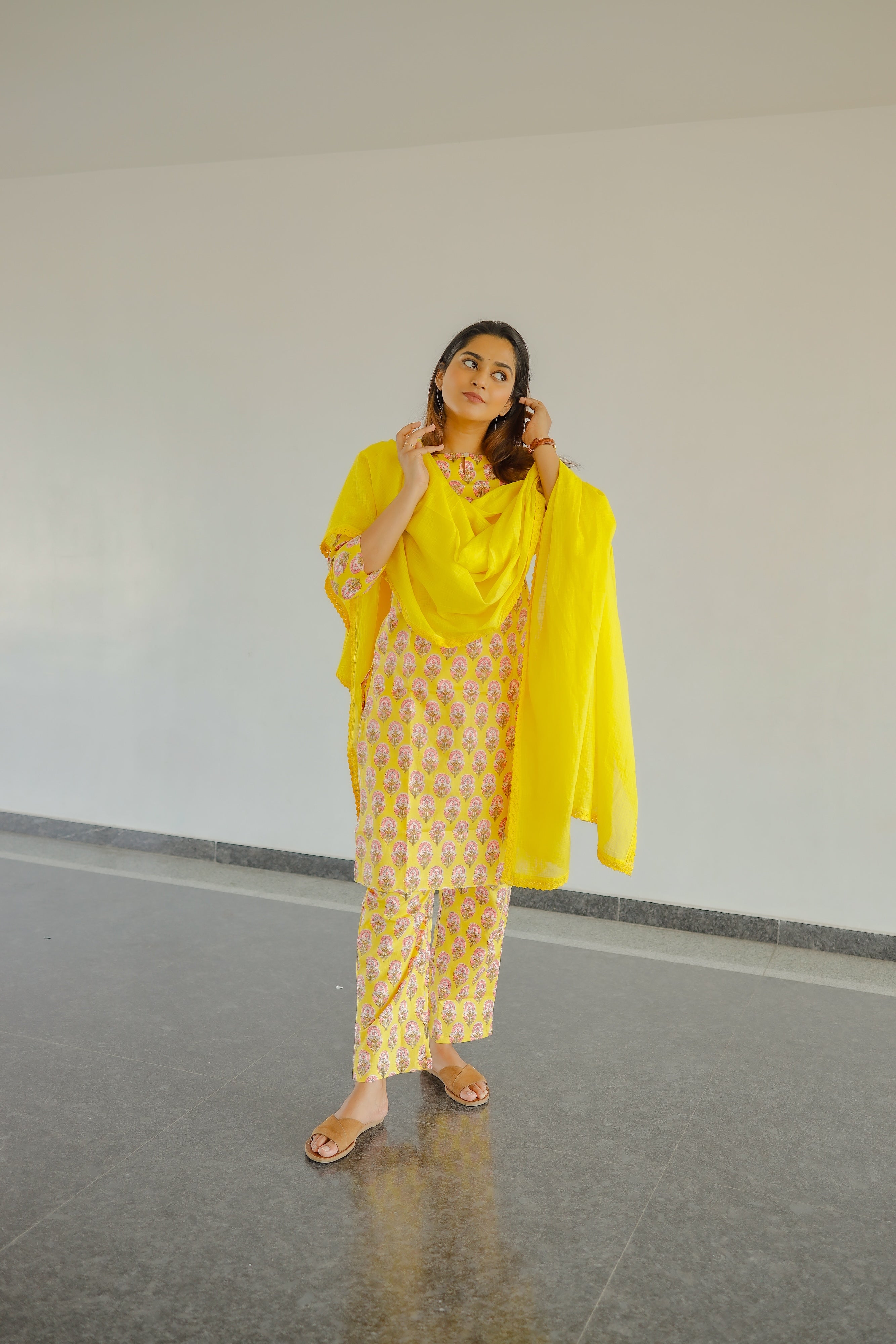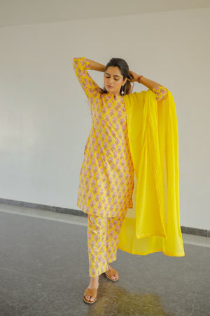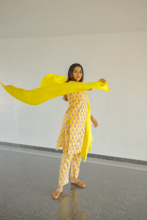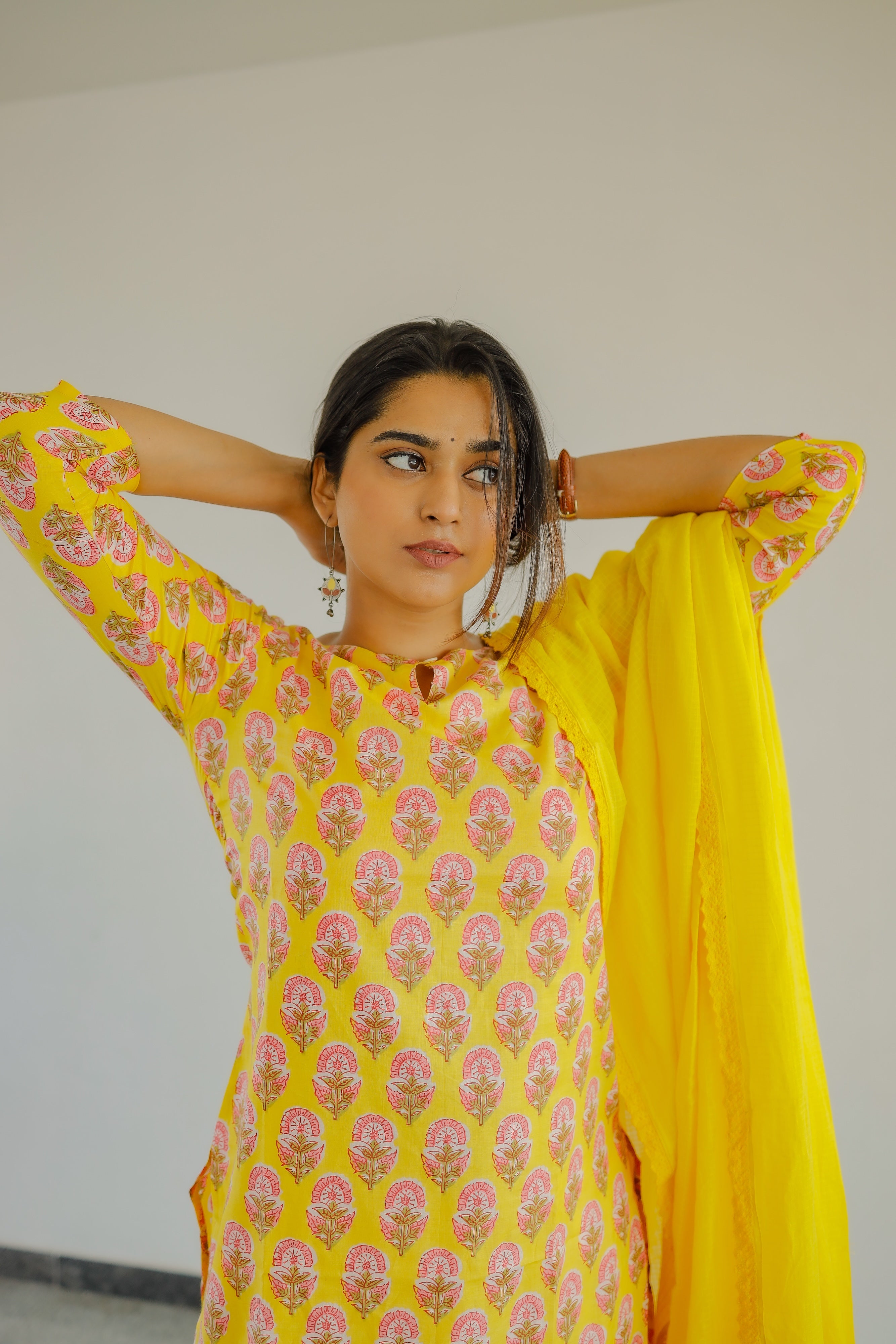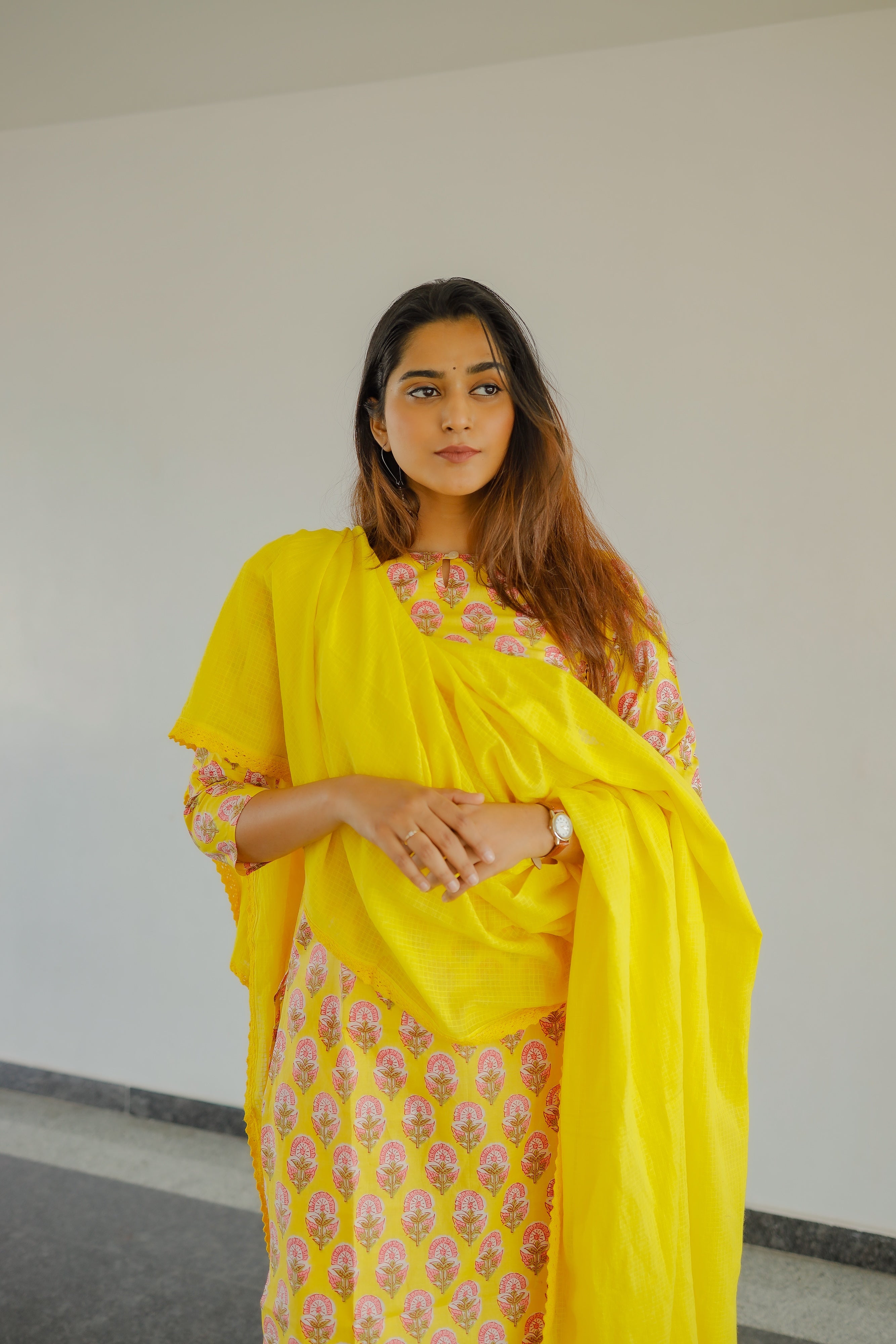 "Yellow and pink floral hand block printed cotton coord set with a smart neck with key hole detailing and smart sleeves. Comes with matching trousers with pockets. Paired with a yellow kota dupatta which has crochia lace highlights.