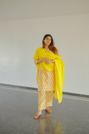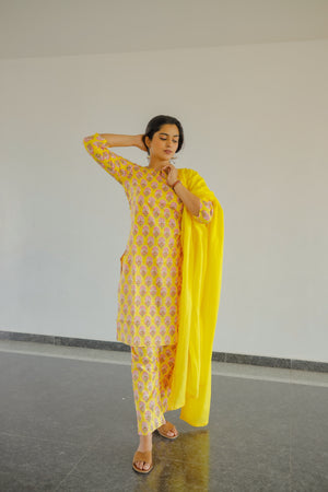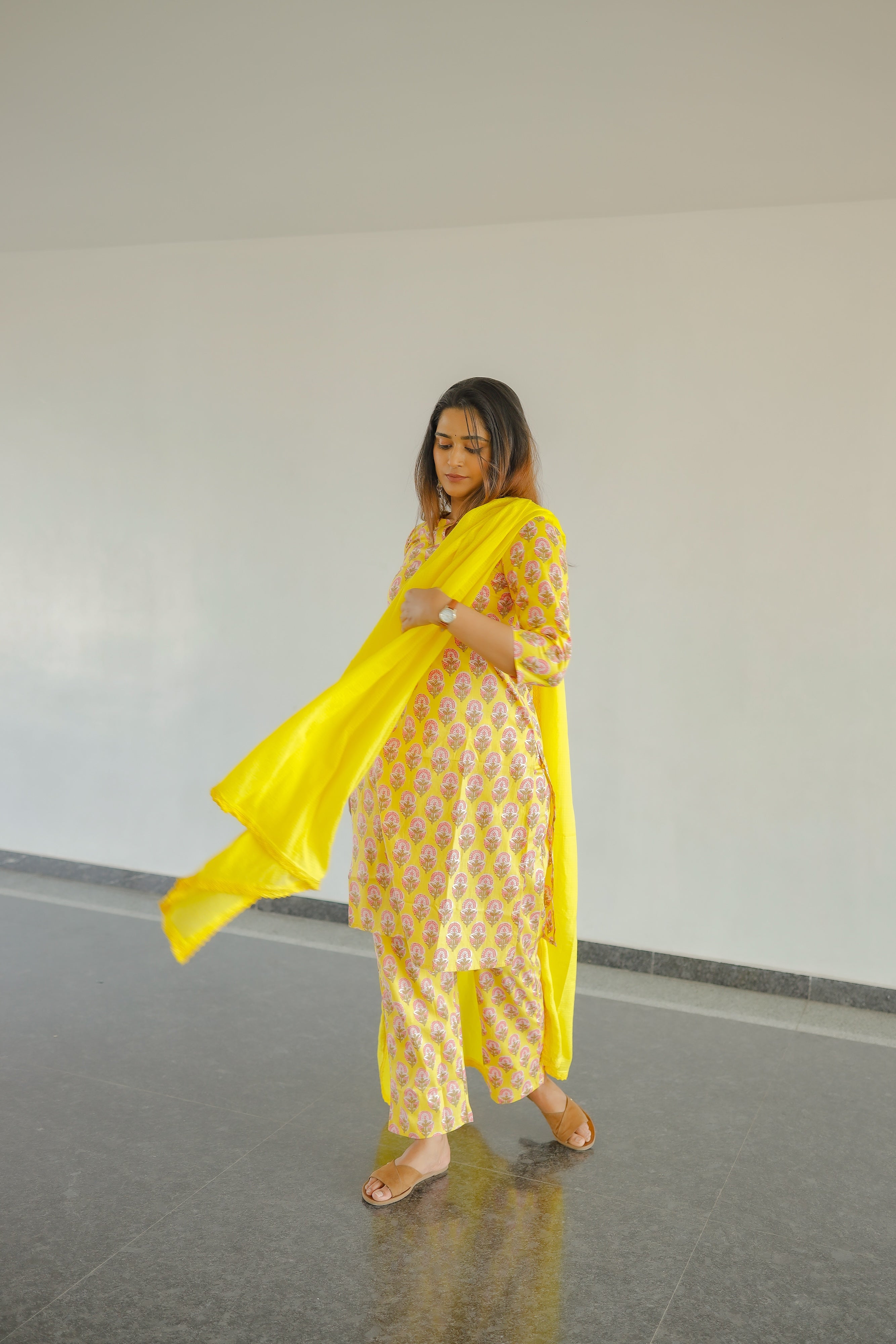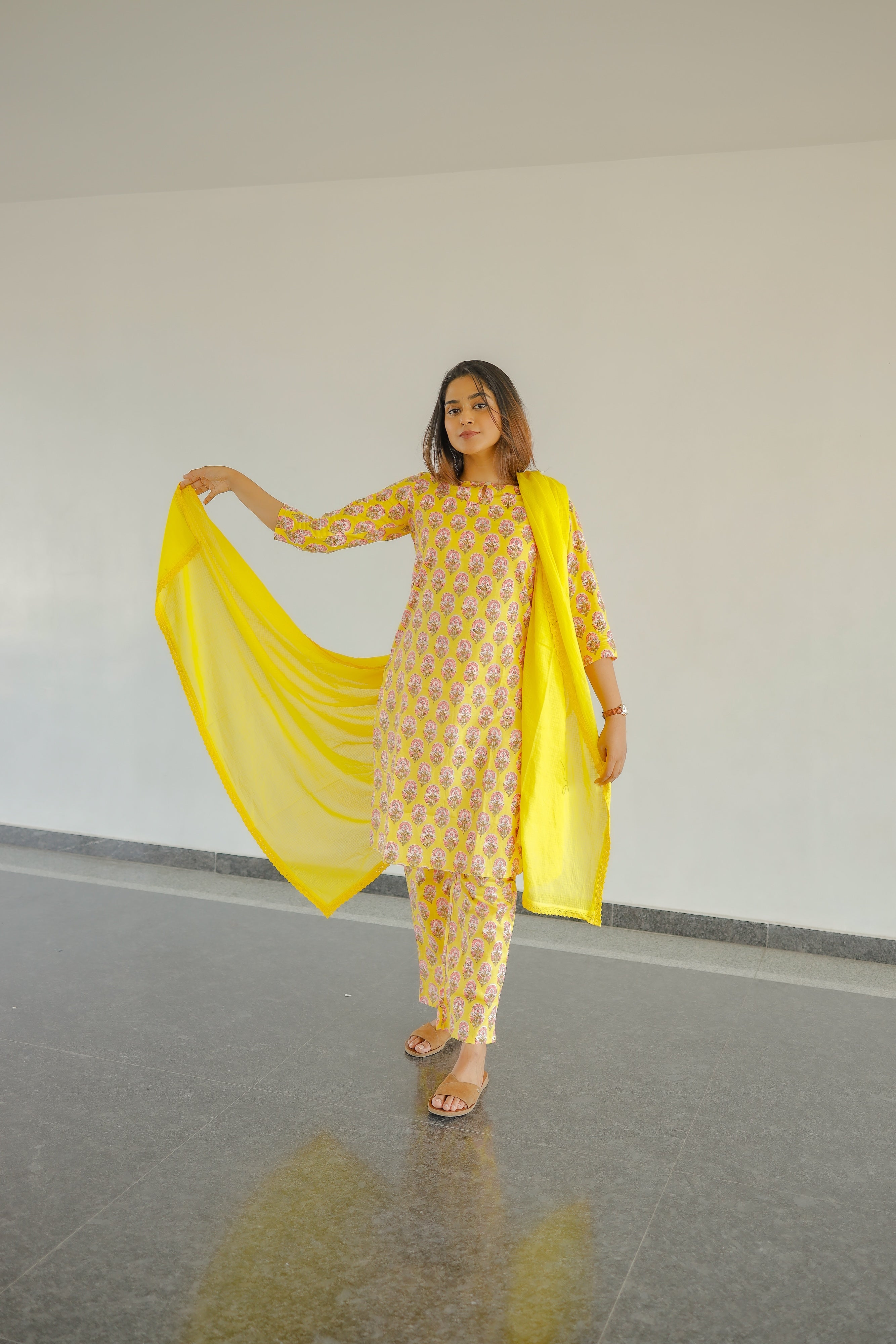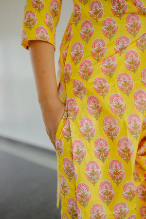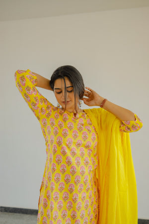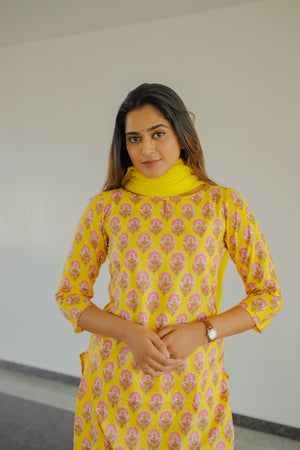 "Yellow and pink floral hand block printed cotton coord set with a smart neck with key hole detailing and smart sleeves. Comes with matching trousers with pockets. Paired with a yellow kota dupatta which has crochia lace highlights.