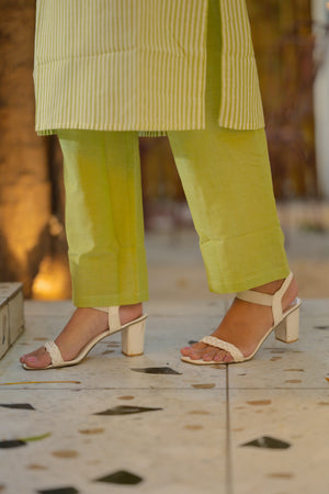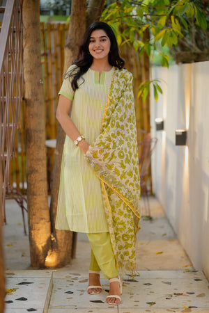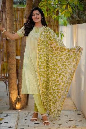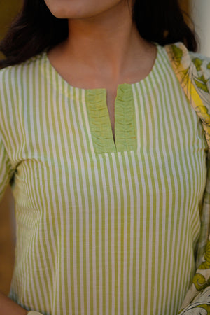 Striped organic hand loom cotton kurta with smart sleeves and smart pintuck neckline with matching trousers with functional pockets with complimenting pen kalamkari silk dupatta in a beautiful apple green colour.