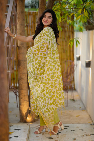 Barkavi ( apple green ) - handloom cotton suit set with pen kalamkari dupatta in green