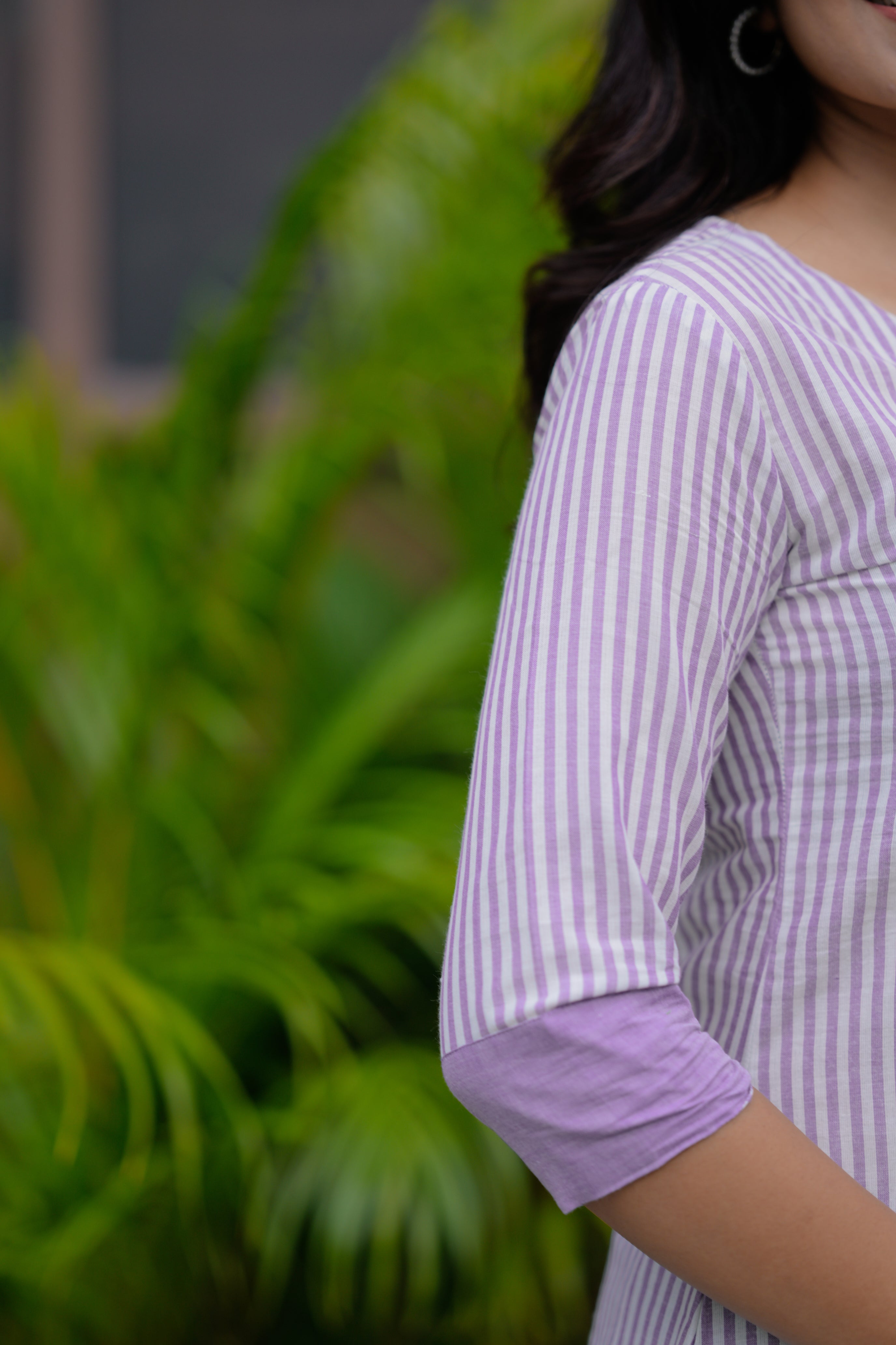 Striped organic hand loom cotton kurta with smart sleeves and smart pintuck neckline with matching trousers with functional pockets with complimenting pen kalamkari silk dupatta in a beautiful apple green colour.