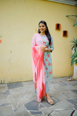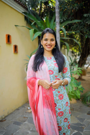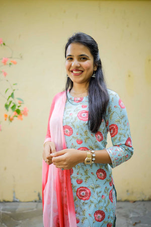 Bhoomika - Floral handblock printed organic cotton suit set in blue and pink