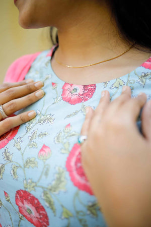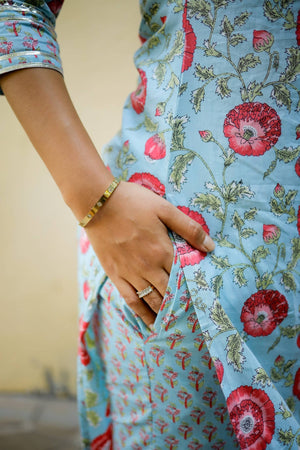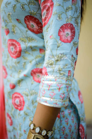 Pastel blue organic cotton kurta with pretty floral hand block prints all over in pink and red. 3/4th sleeves with gayzer detailing.