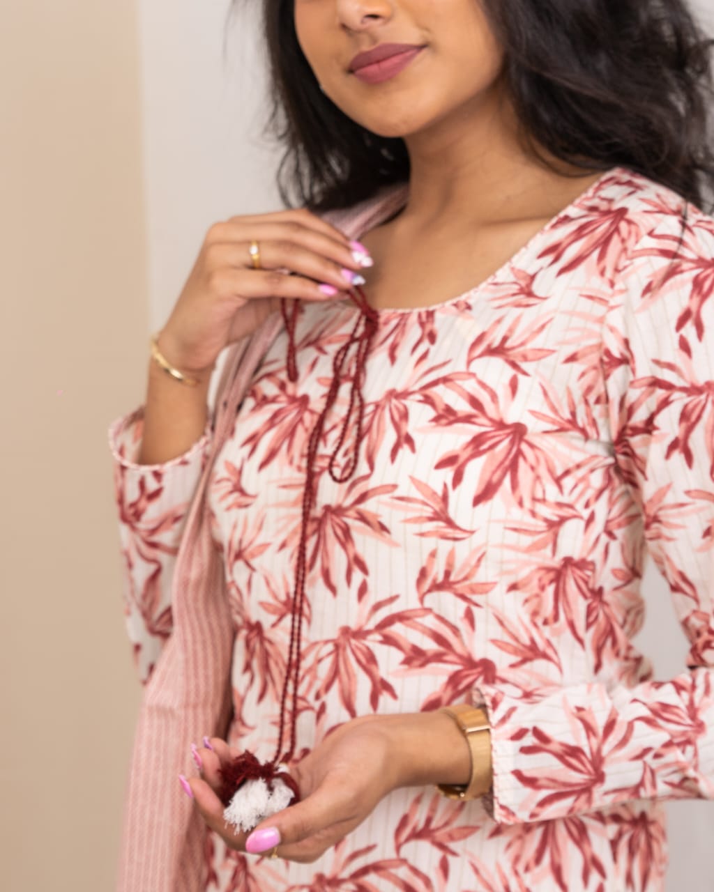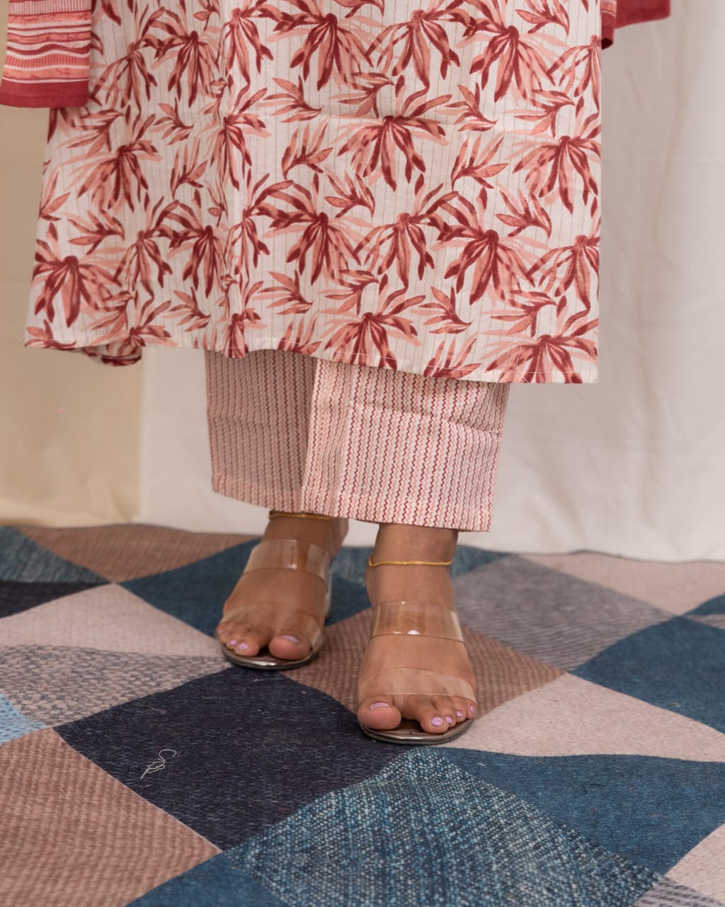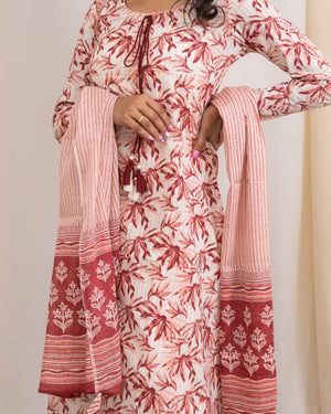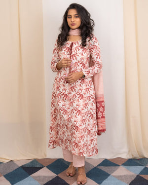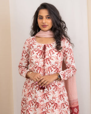 - Floral hand block printed A line cotton suit set with pretty hand done tassels