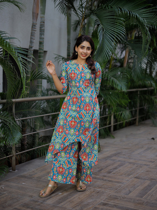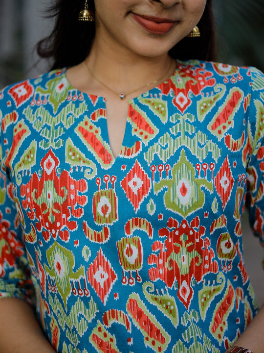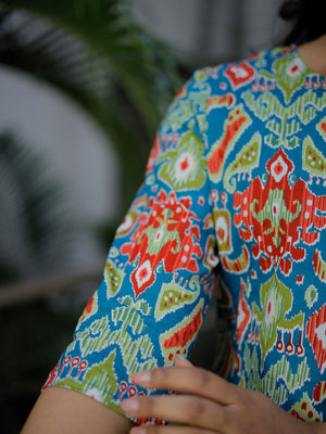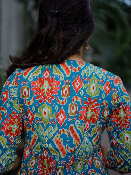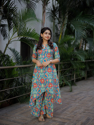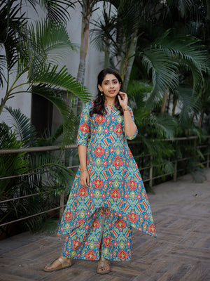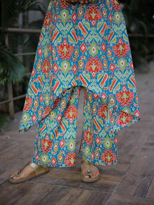 — Abstract printed A line organic cotton coord set with smart neckline and sleeves. The silhouette is a hi low pattern and so easy breezy to wear. Perfect for office / college.