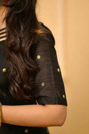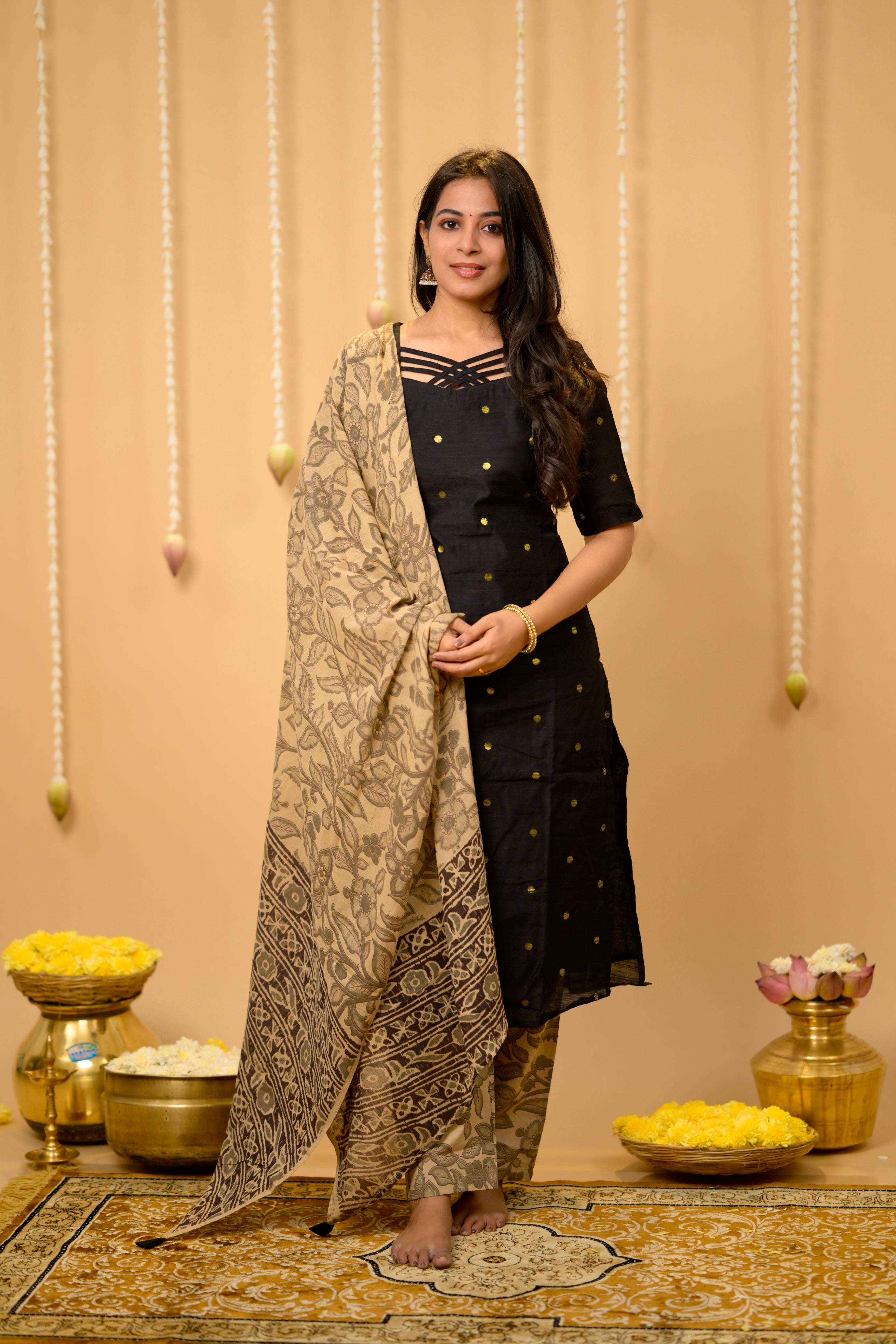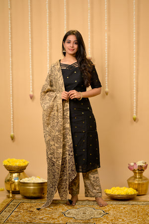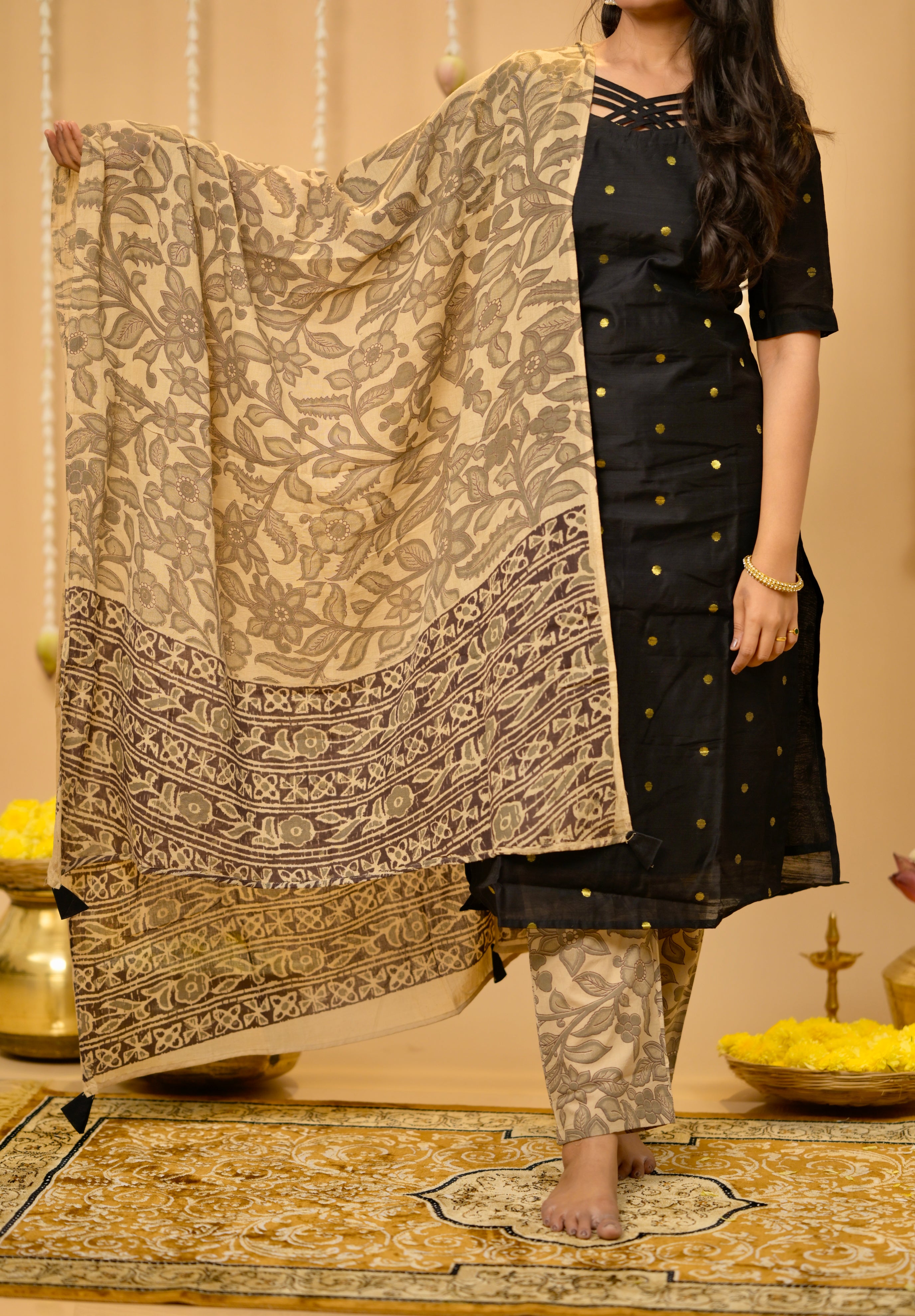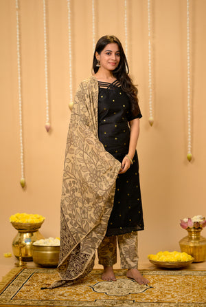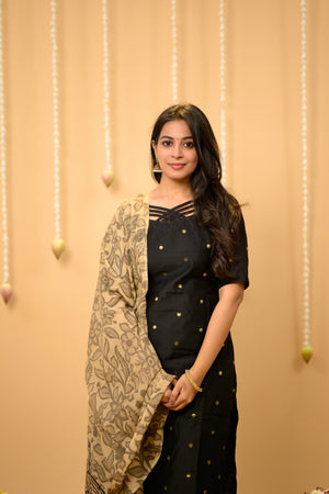 Kothai (black) - handloom silk by cotton suit set with hand painted kalamkari dupatta in black