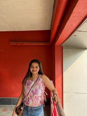 Crop top #7 - Floral printed organic top in beige and pink