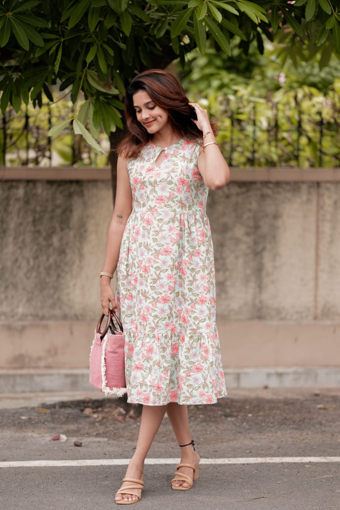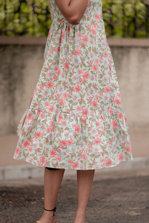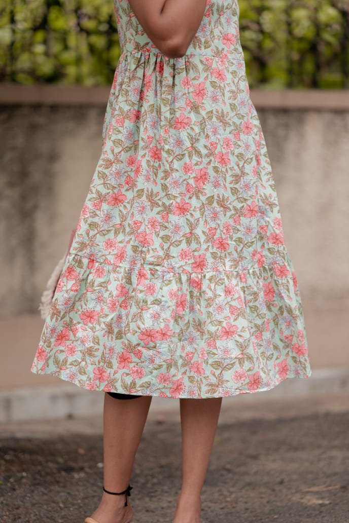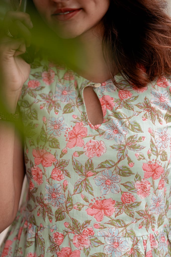 Dress 2 - Floral handblock printed cotton dress in pastel green