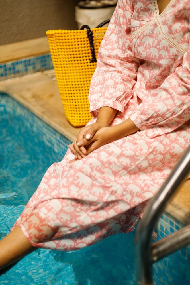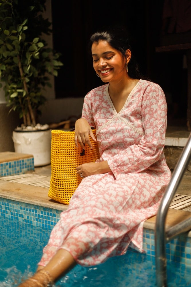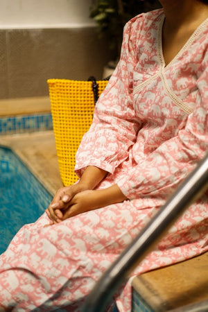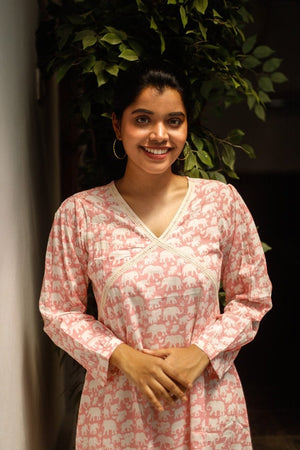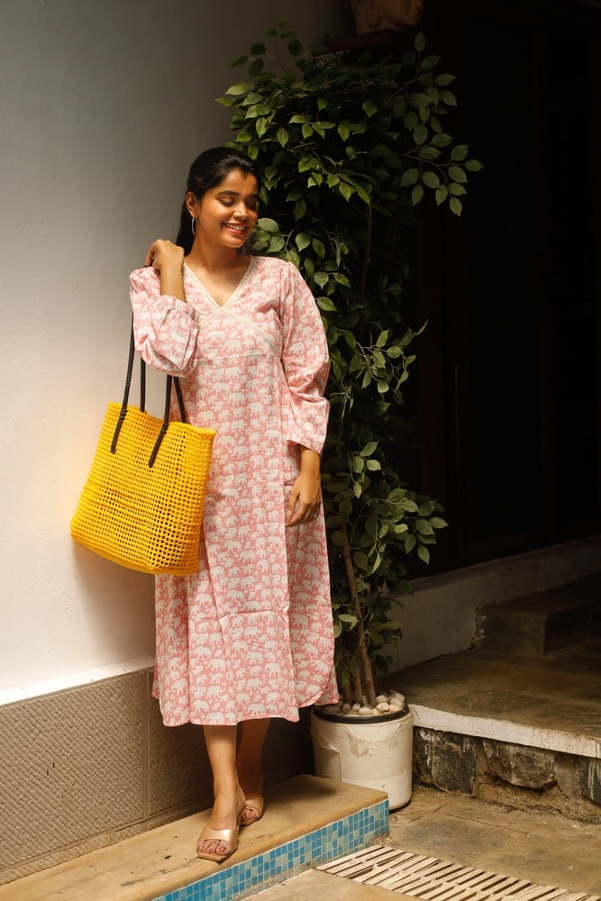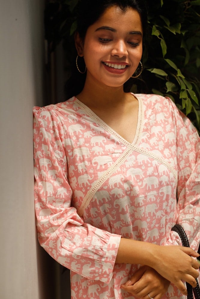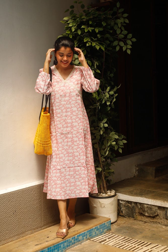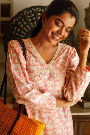 Baby pink organic cotton dress with cute elephant hand block prints all over with a super smart and chic neck detailing with crochia lace highlights and a dramatic sleeve with puff detailing.