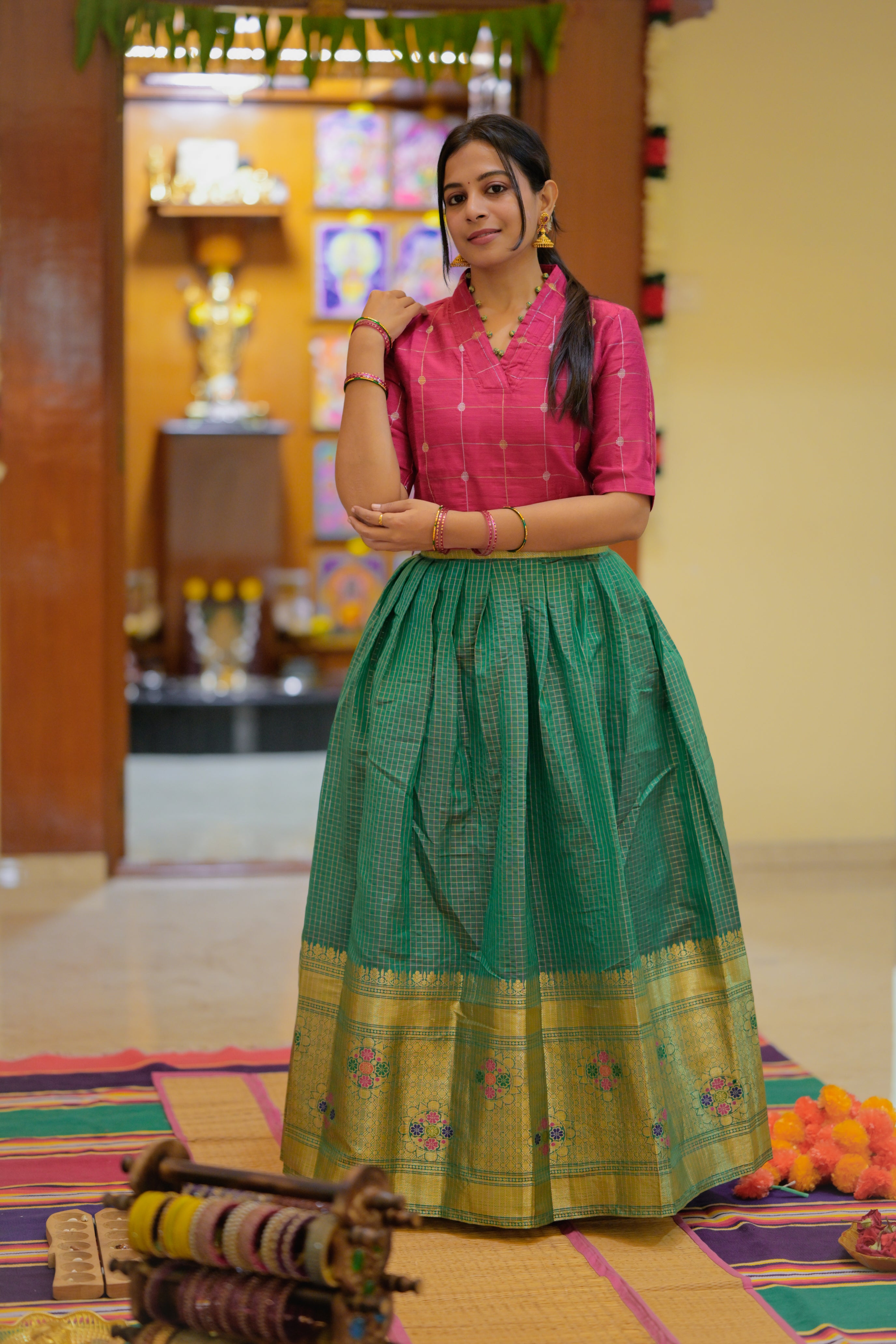 • Skirt Color & Border: Green skirt with golden zari border and floral motifs