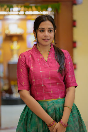• Blouse Color & Design: Magenta with subtle checkered pattern and V-neck detailing