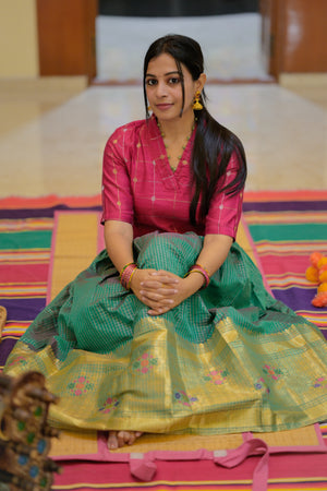 Durga - silk blouse with organza tissue silk skirt set in pink and green