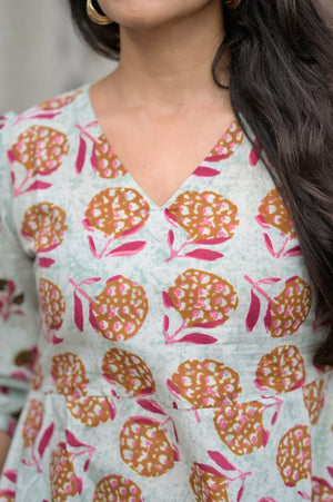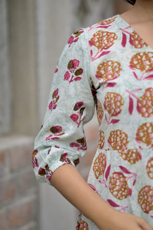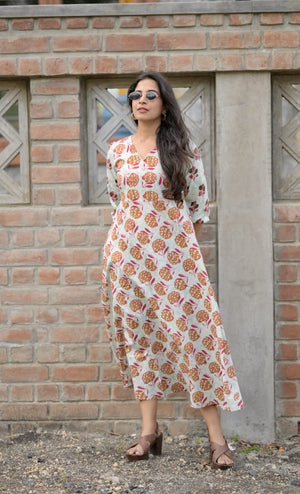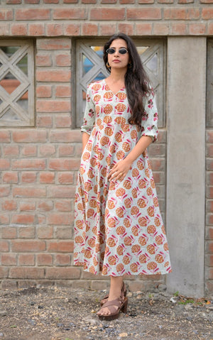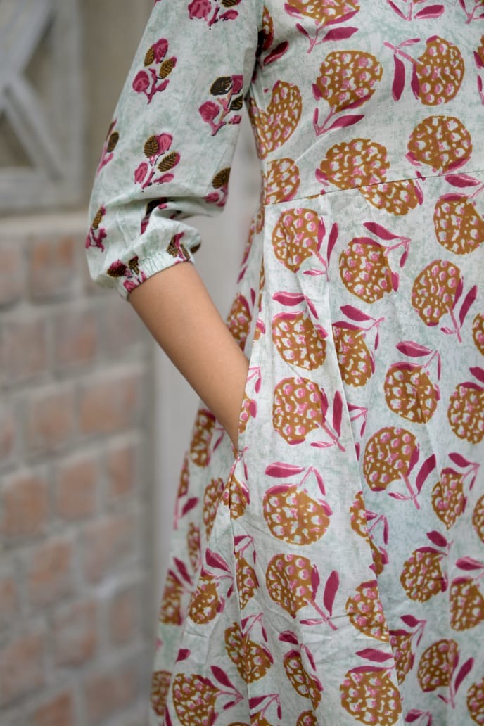 Beautiful handblock printed organic cotton A line dress with a smart neckline, baloon sleeves with elastic detailing with functional pockets.