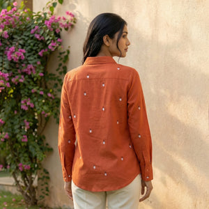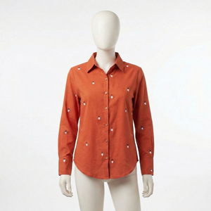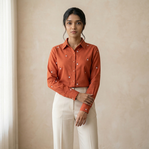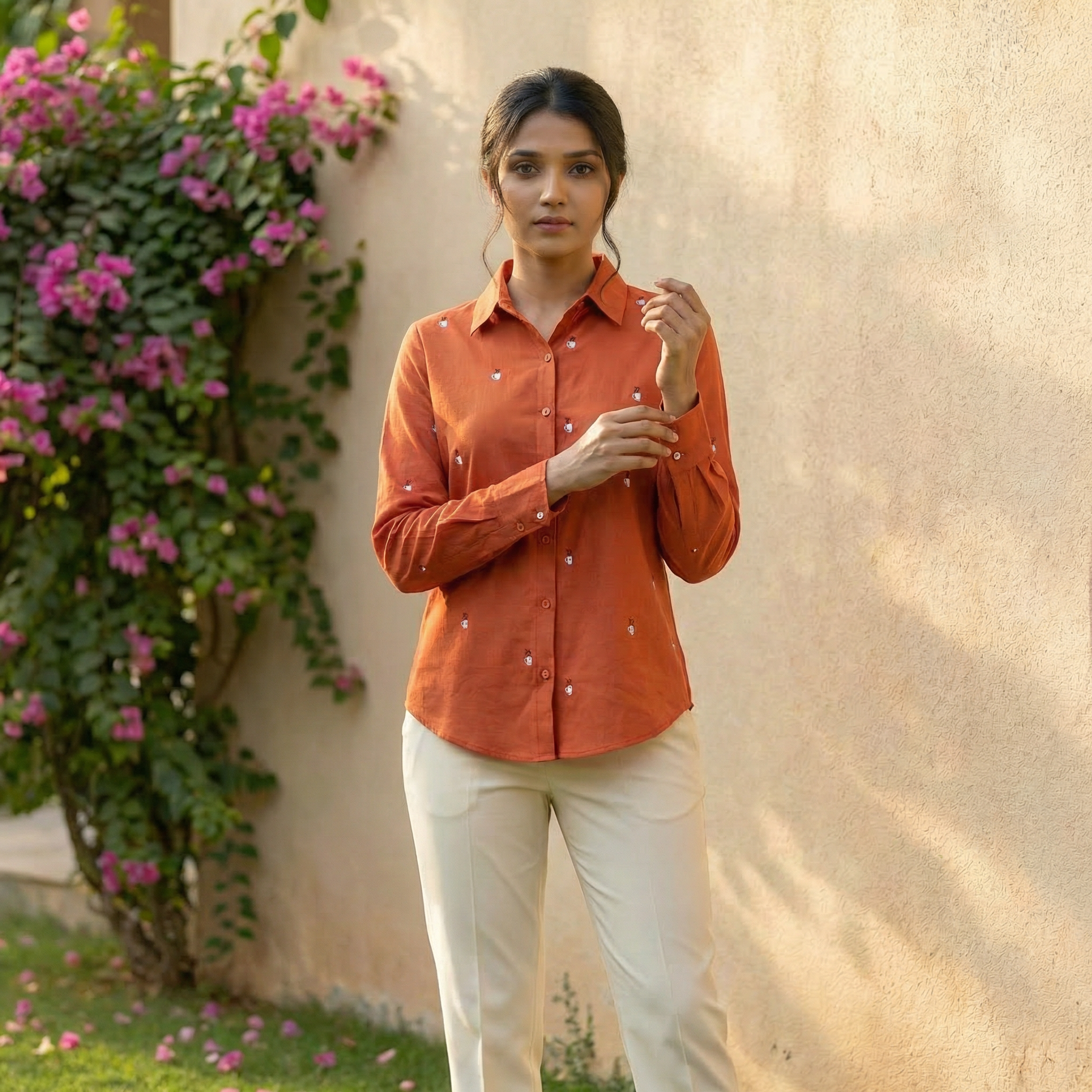 Add a touch of charm to your everyday style with this elegant orange beautifully detailed with coffee embroidery all over. Designed with a smart collar, full sleeves, and a comfortable fit. Crafted from soft, breathable fabric for all-day comfort and effortless style.✨