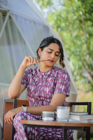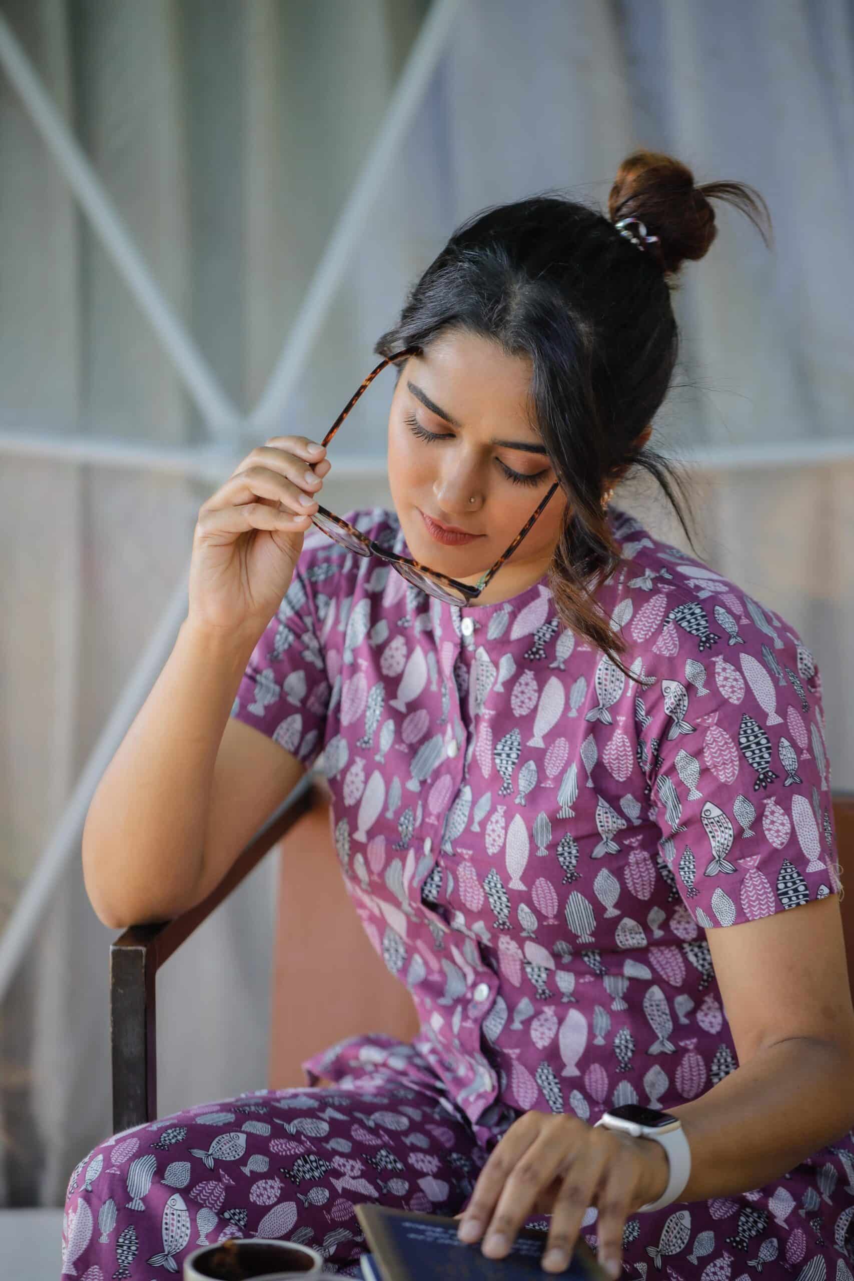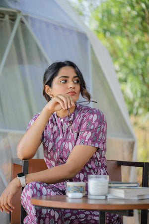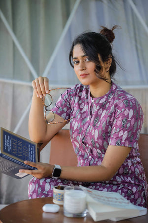 "– Fish hand block printed top in purple colour with openable buttons ( an Addn feature to aid nursing mummas)