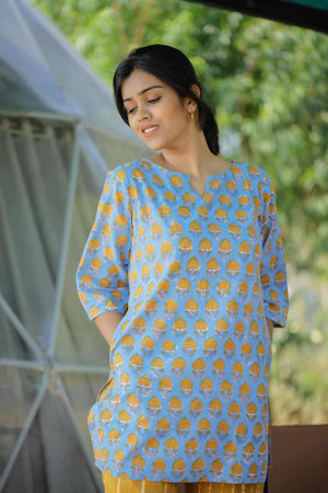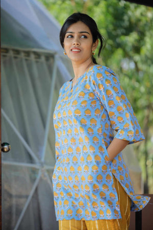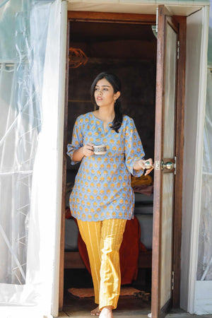 – Shibori hand block printed trousers in a contrasting mustard yellow