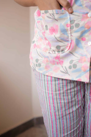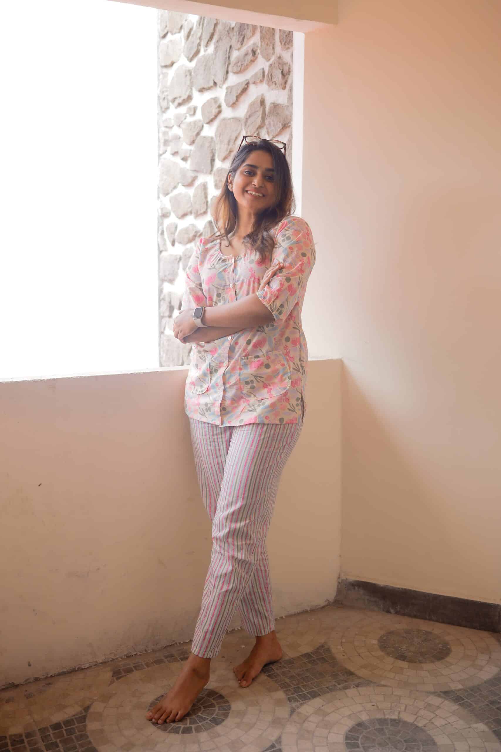 "- Floral hand block printed top in a pastel colour palette with openable buttons ( an Addn feature to aid nursing mummas)