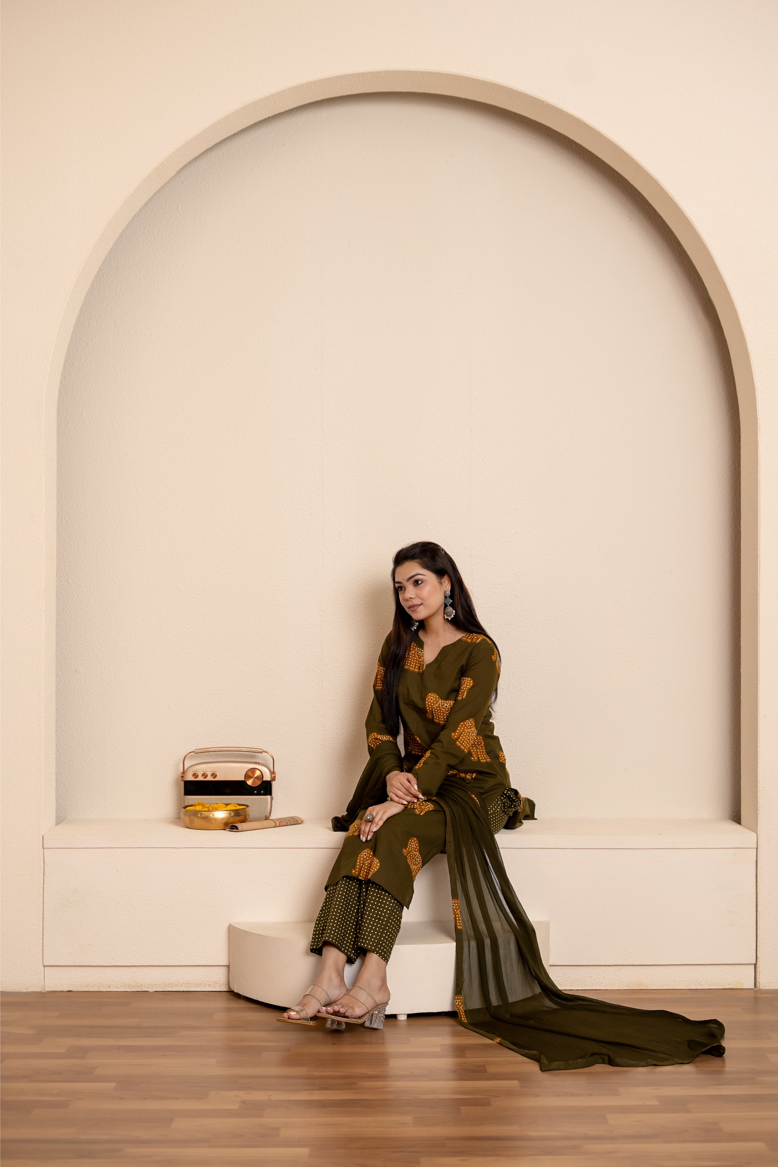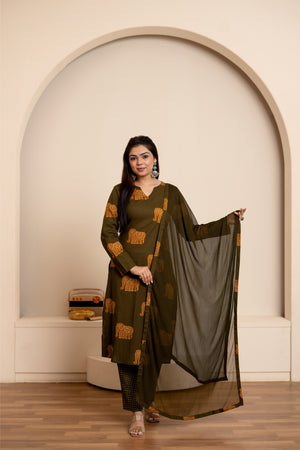 - Elephant hand block printed organic cotton suit set with chiffon dupatta with fabric borders. Smart neck detailing and full sleeve on the kurta, polka hand block printed trousers with functional pockets and chiffon dupatta which is easy and breezy with fabric borders.