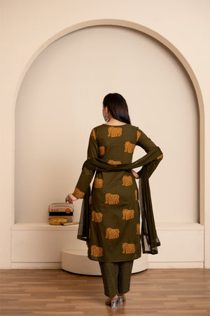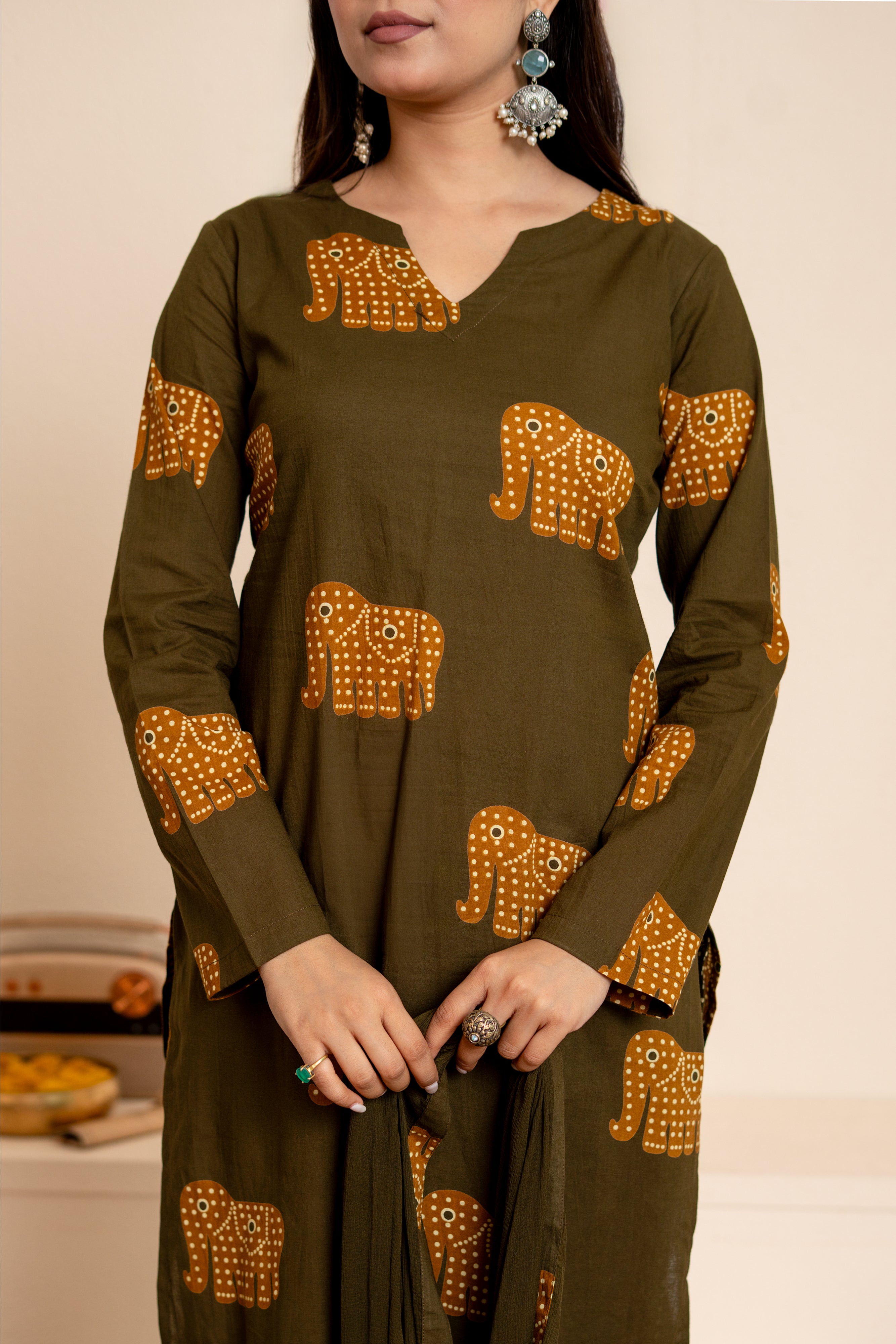 Hathira - elephant hand block printed cotton suit set in green and yellow