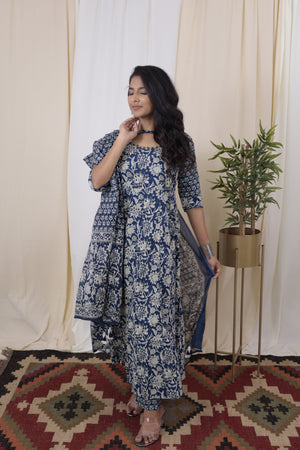 Himanshi- jaal printed cotton anarkali suit set in royal blue