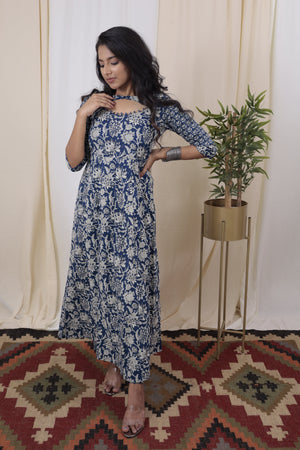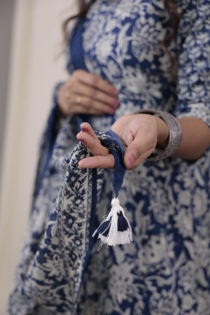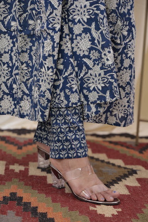 A beautiful shade of royal blue jaal printed flared anarkali organic cotton kurta with smart V neck with potli buttons. Comes with matching trousers with functional pockets which has gota laces at hemline.