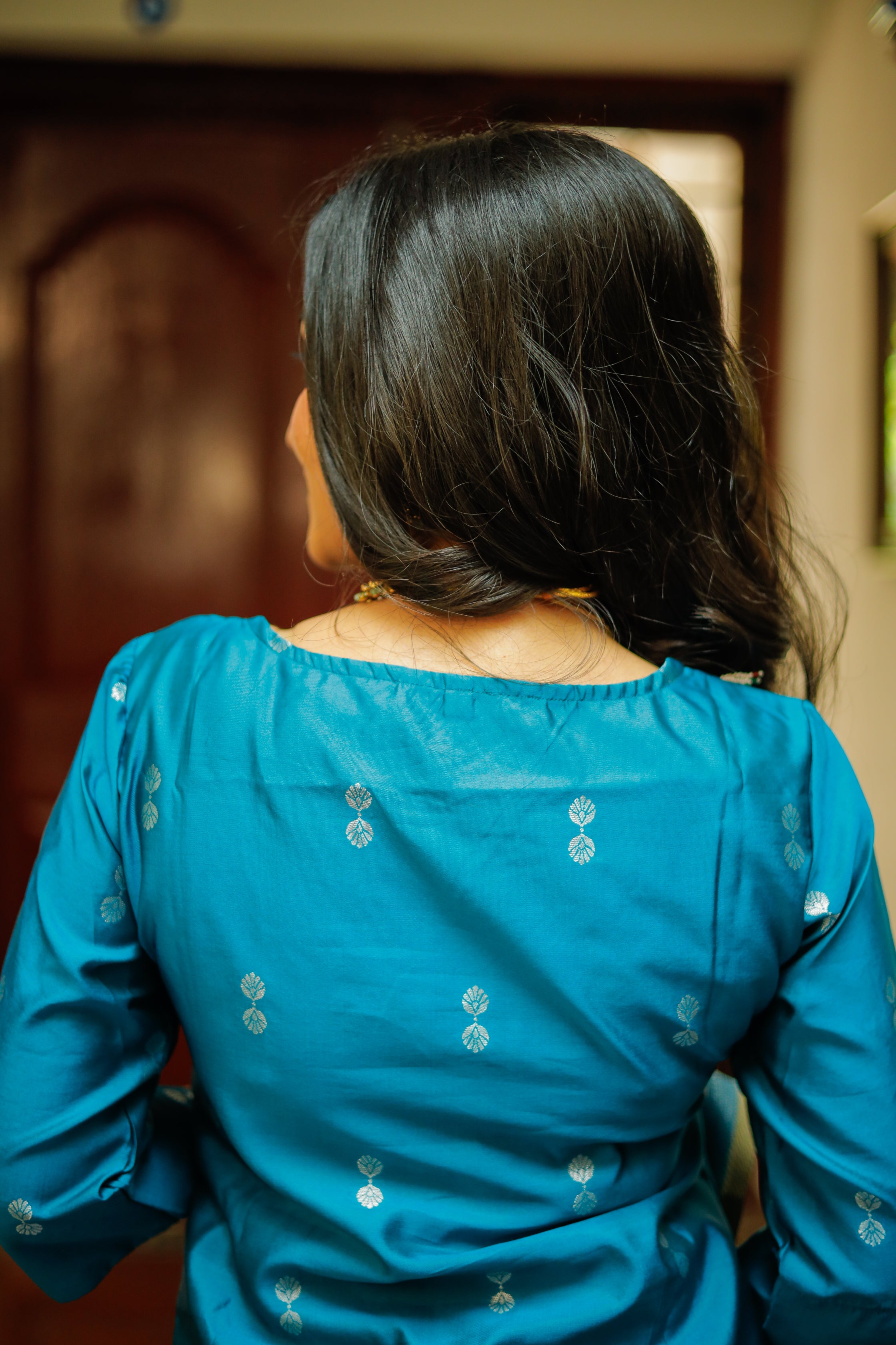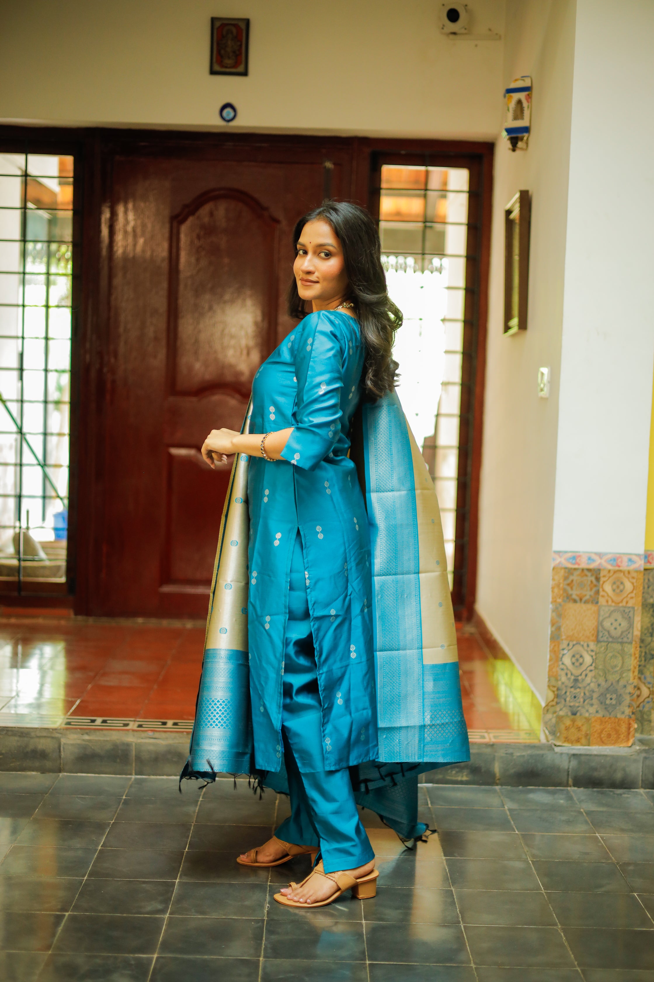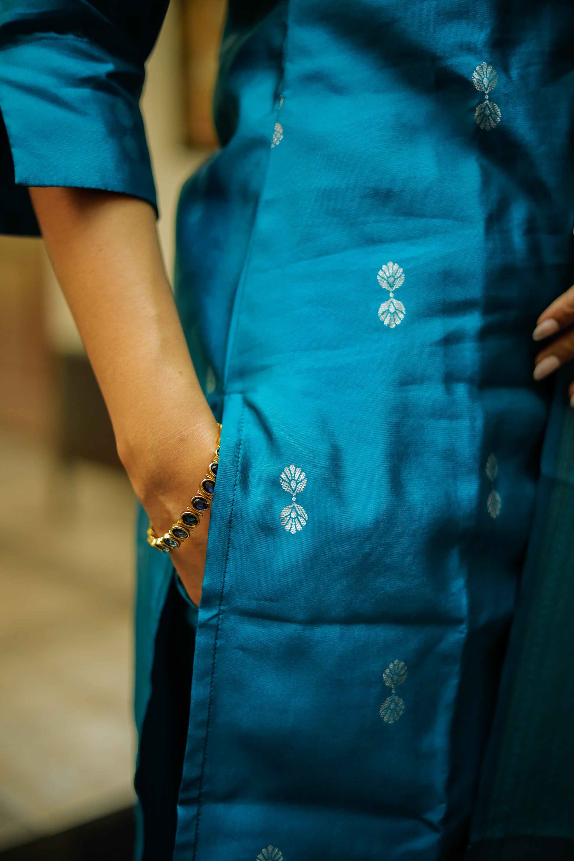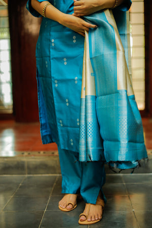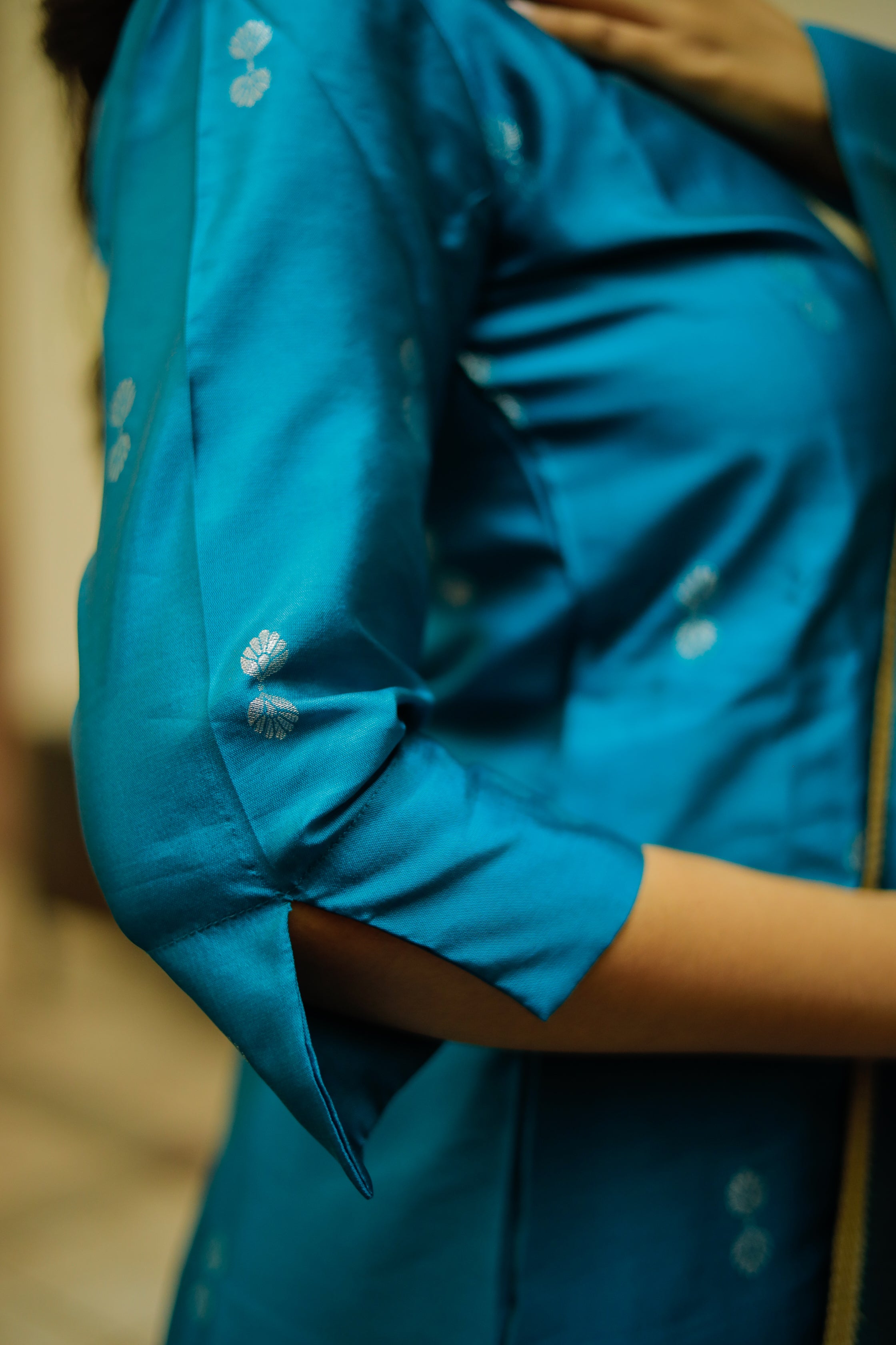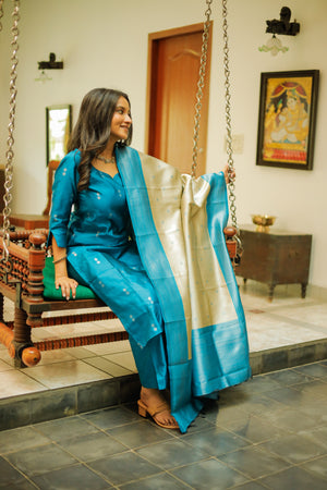 Blue colour silver zari vegan semi kanchipuram silk kurta set which has silver zari buttas all over. It has a smart neck detailing and short sleeves. The kurta has lining attached.