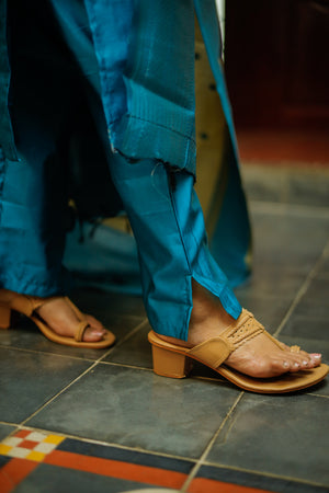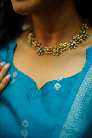 Paired with a blue colour vegan semi kanchipuram silk trousers with functional pockets. Paired with beautiful green vegan semi kanchipuram silk dupatta which has silver zari detailing all over and tassels.