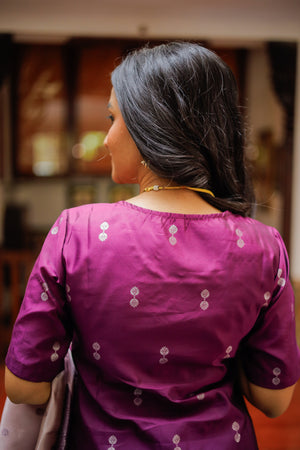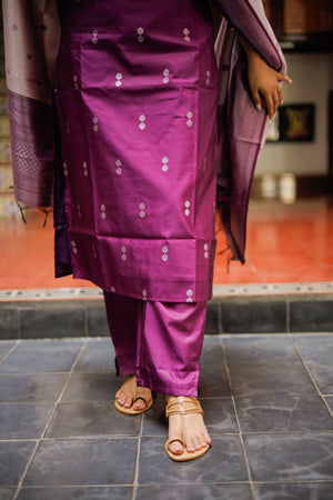 Purple colour silver zari vegan semi kanchipuram silk kurta set which has silver zari buttas all over. It has a smart neck detailing and short sleeves. The kurta has lining attached.
