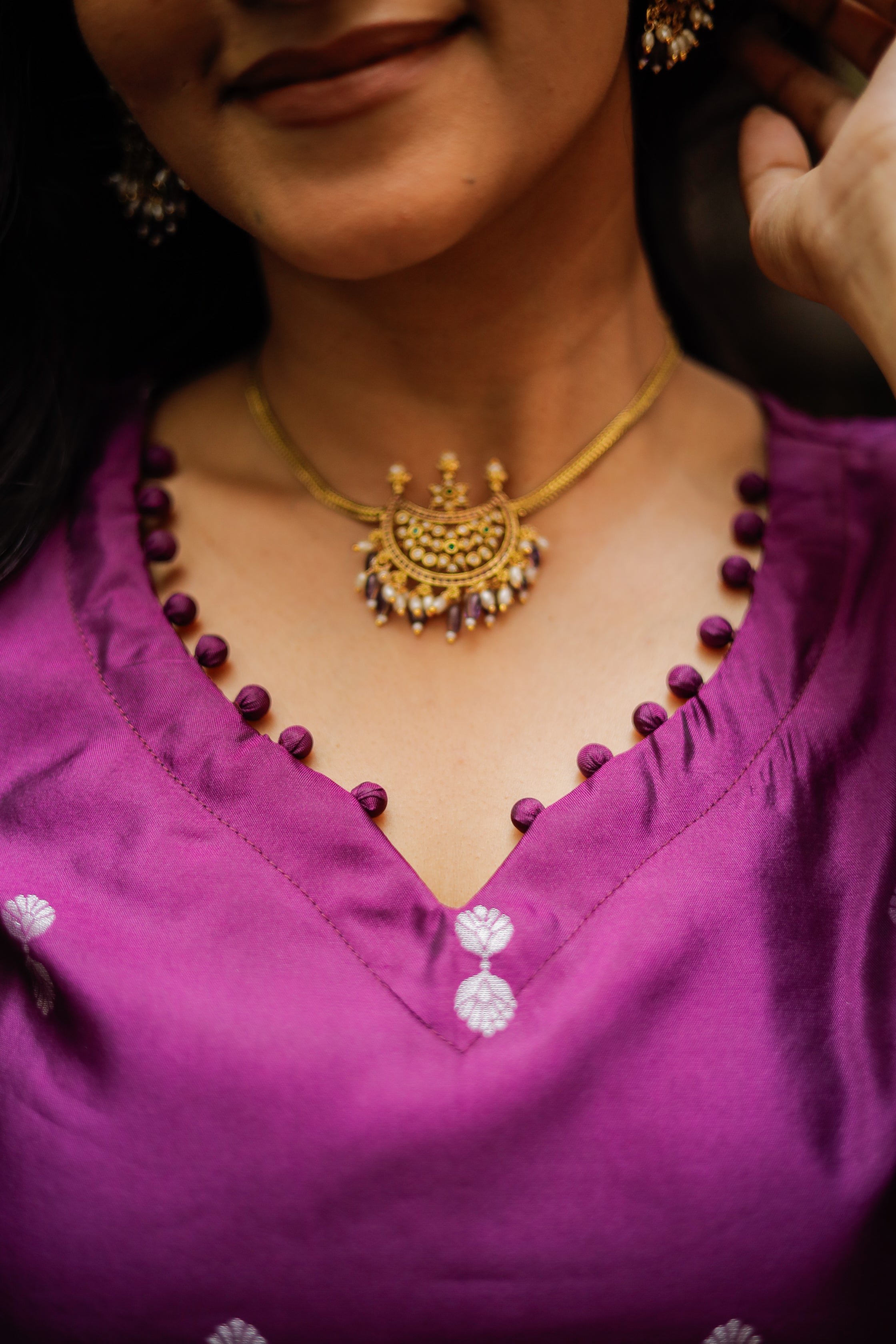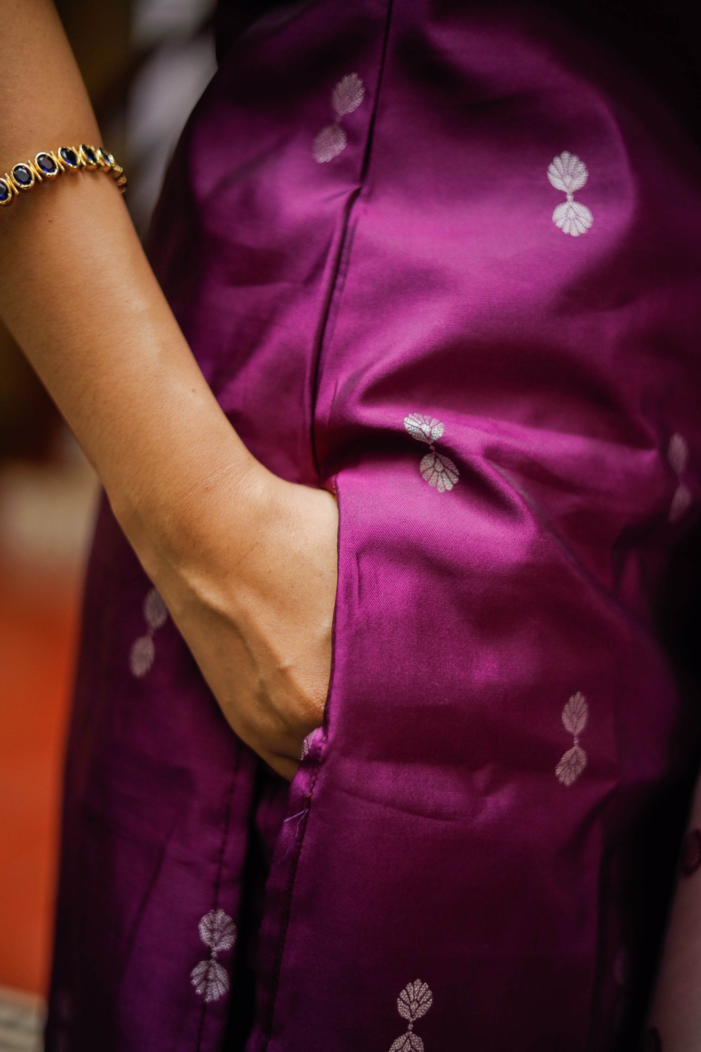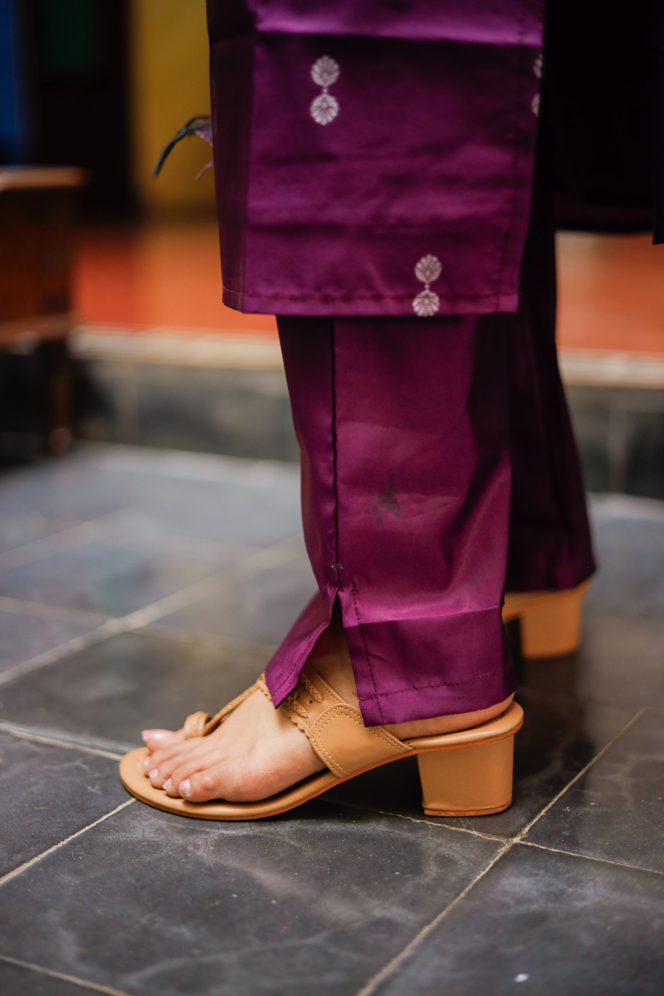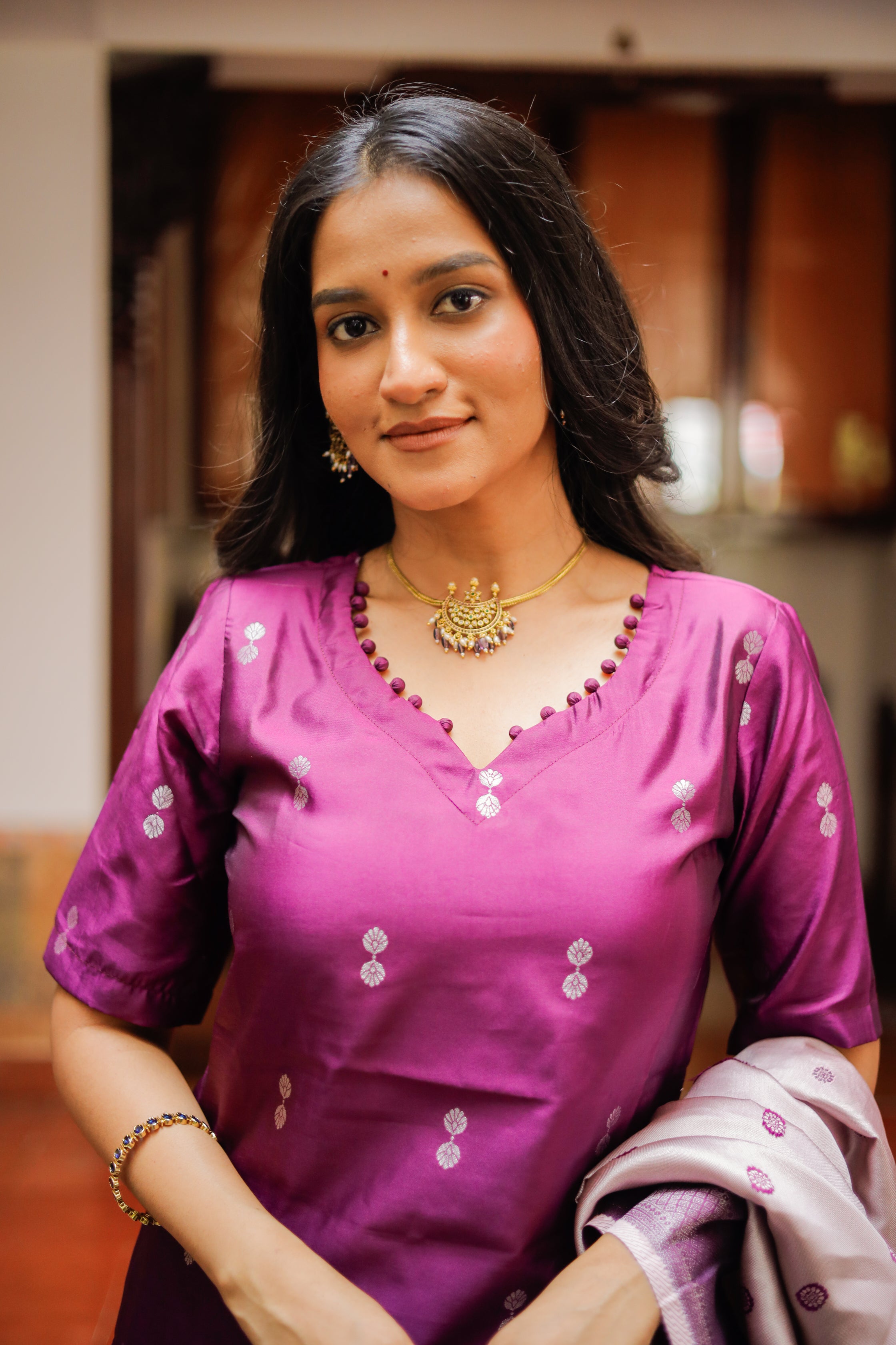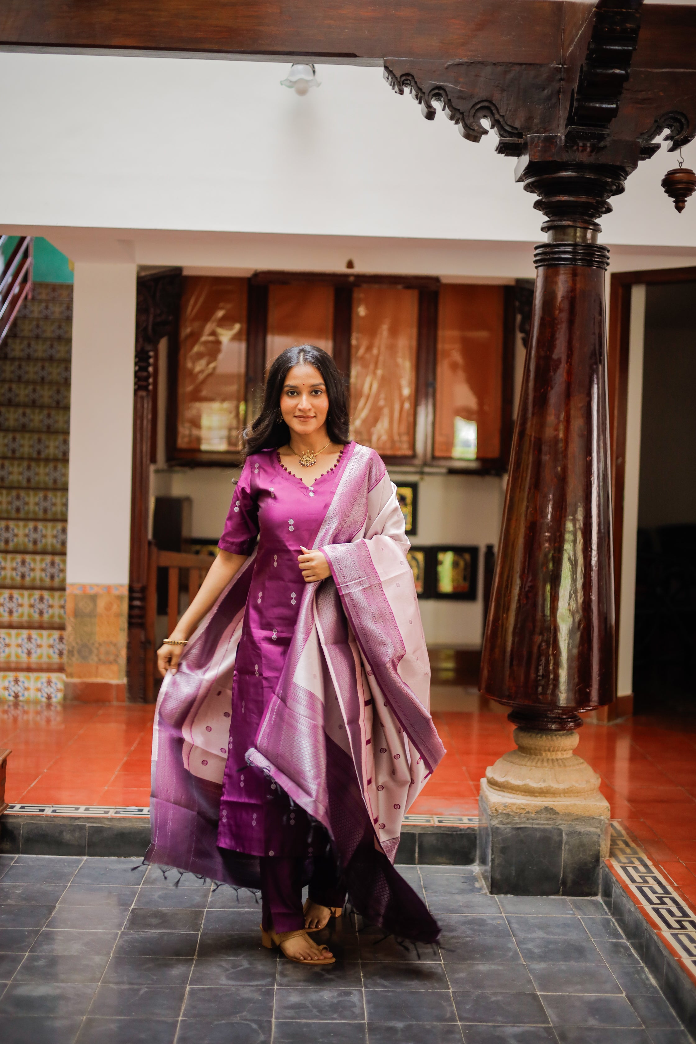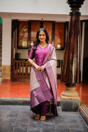 Paired with a purple colour vegan semi kanchipuram silk trousers with functional pockets. Paired with beautiful lavender vegan semi kanchipuram silk dupatta which has silver zari detailing all over and tassels.