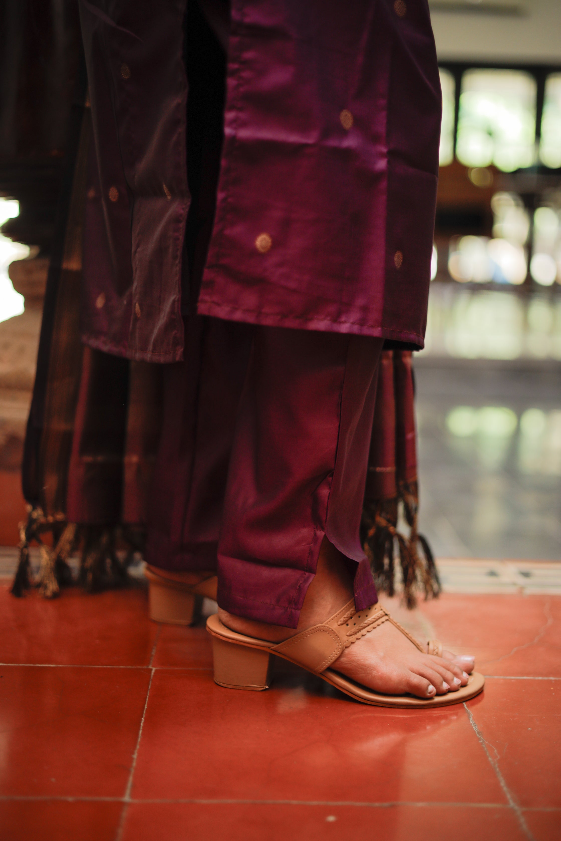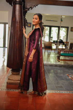 Paired with a wine colour semi kanchipuram silk trousers with functional pockets. Paired with beautiful wine floral gold zari brocade vegan semi kanchipuram silk dupatta which has zari detailing all over and tassels.