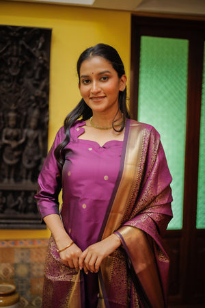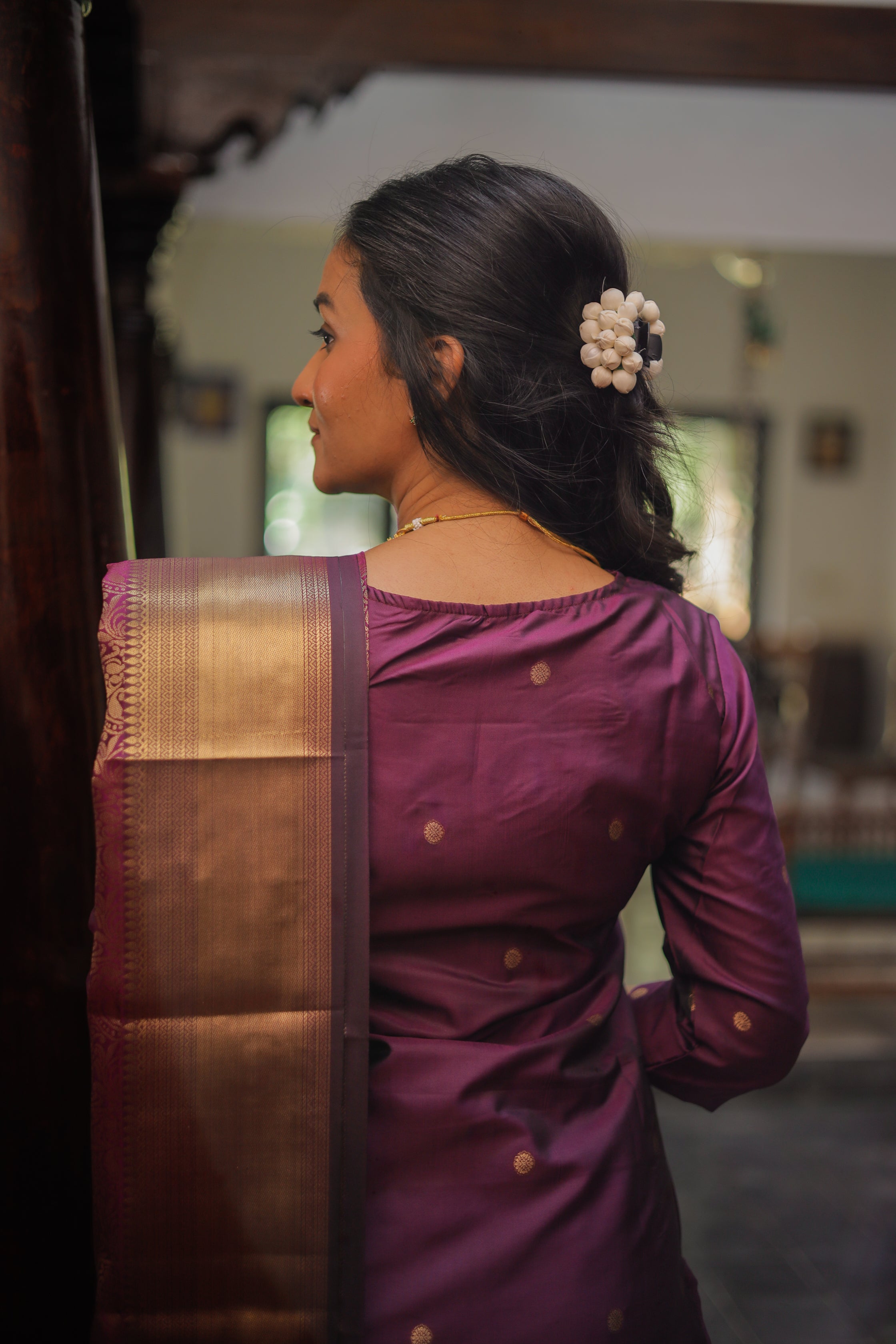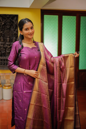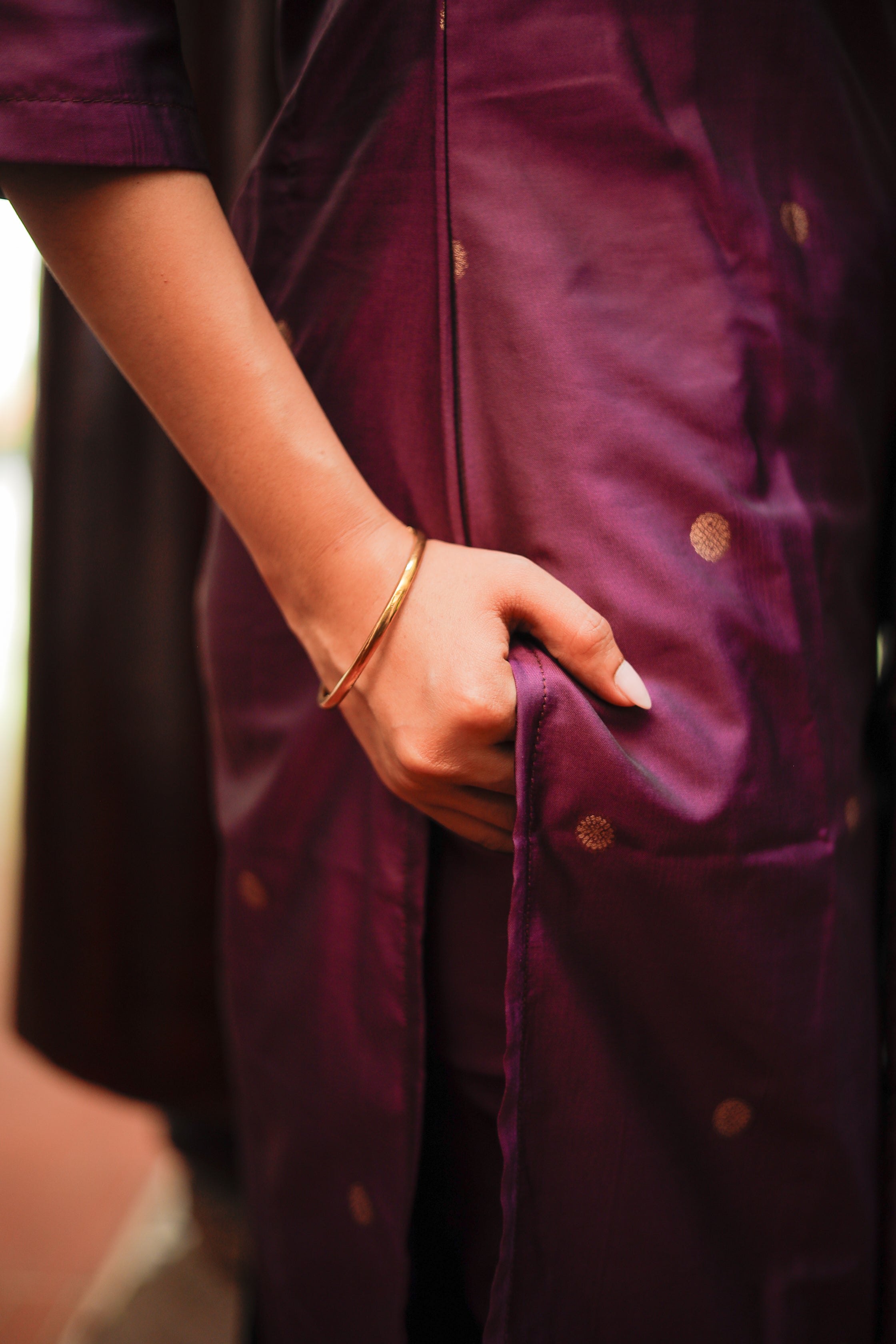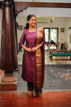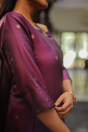 Wine colour vegan semi kanchipuram silk kurta set which has gold zari buttas all over. It has a smart neck detailing and 3/4th sleeves. The kurta has lining attached.