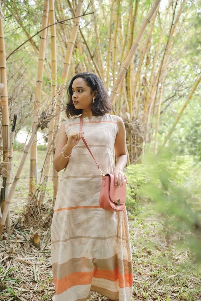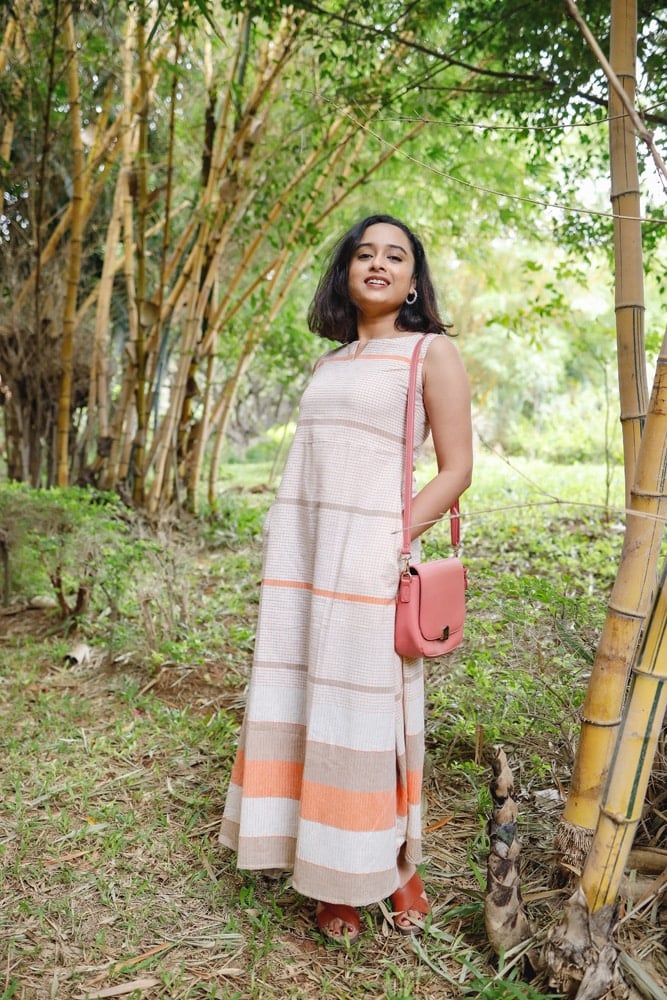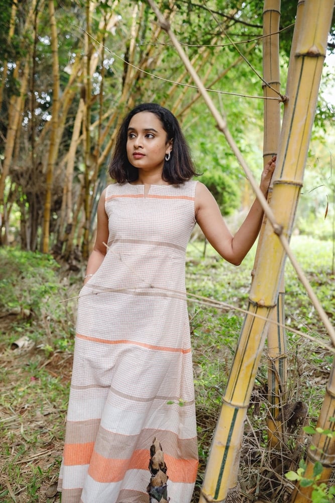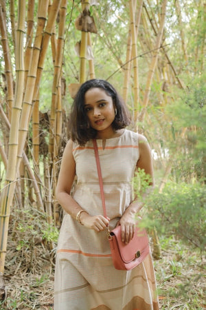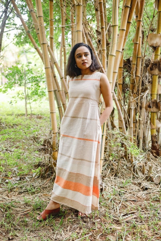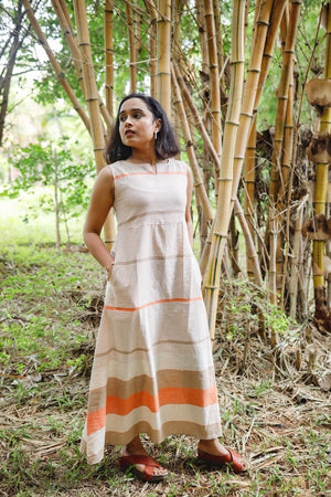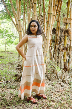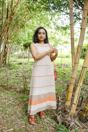 Irene - Handloom linen A line cotton dress in shades of beige and orange.