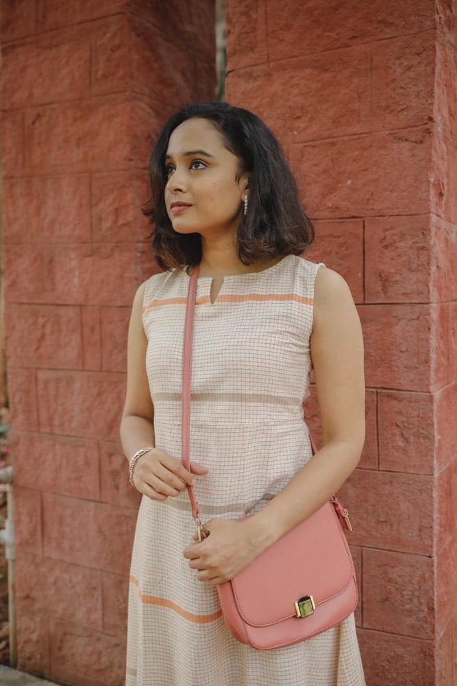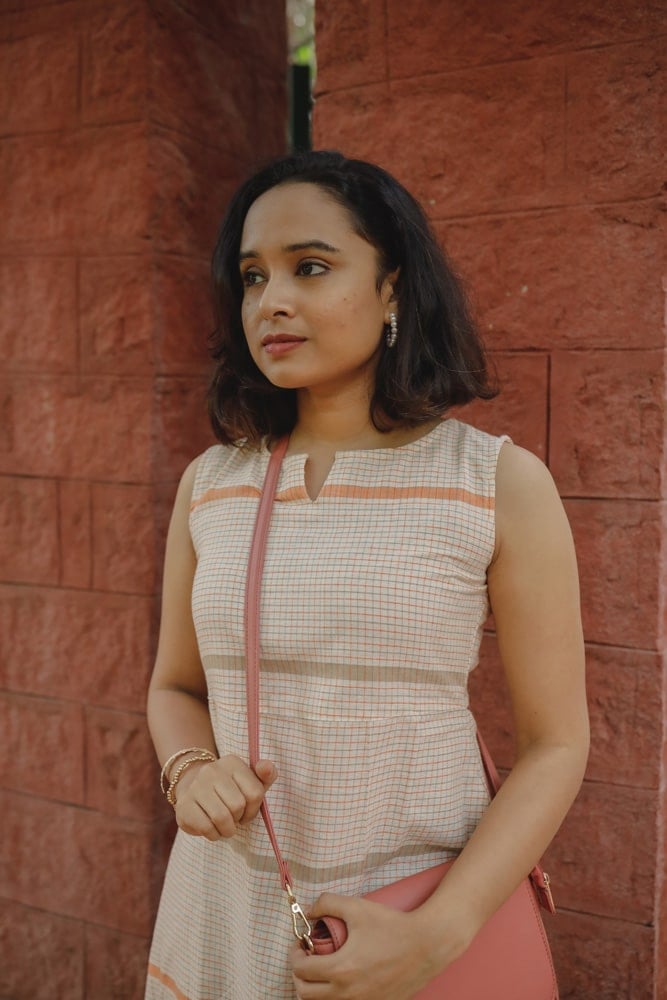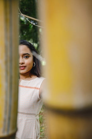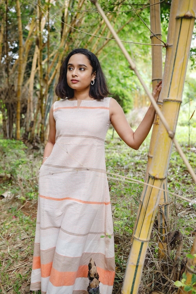 Handloom linen cotton checked A line dress in shades of beige and orange. Smart fit and flare A line dress with a smart neck and it has two pockets on both sides. It's a sleeveless dress ( with attached short sleeves inside the kurta for those who don't prefer sleeveless ). Super chic and comfortable.