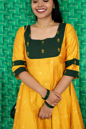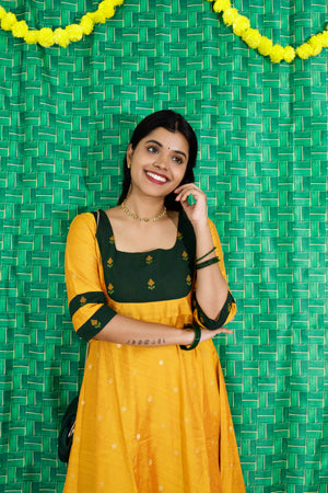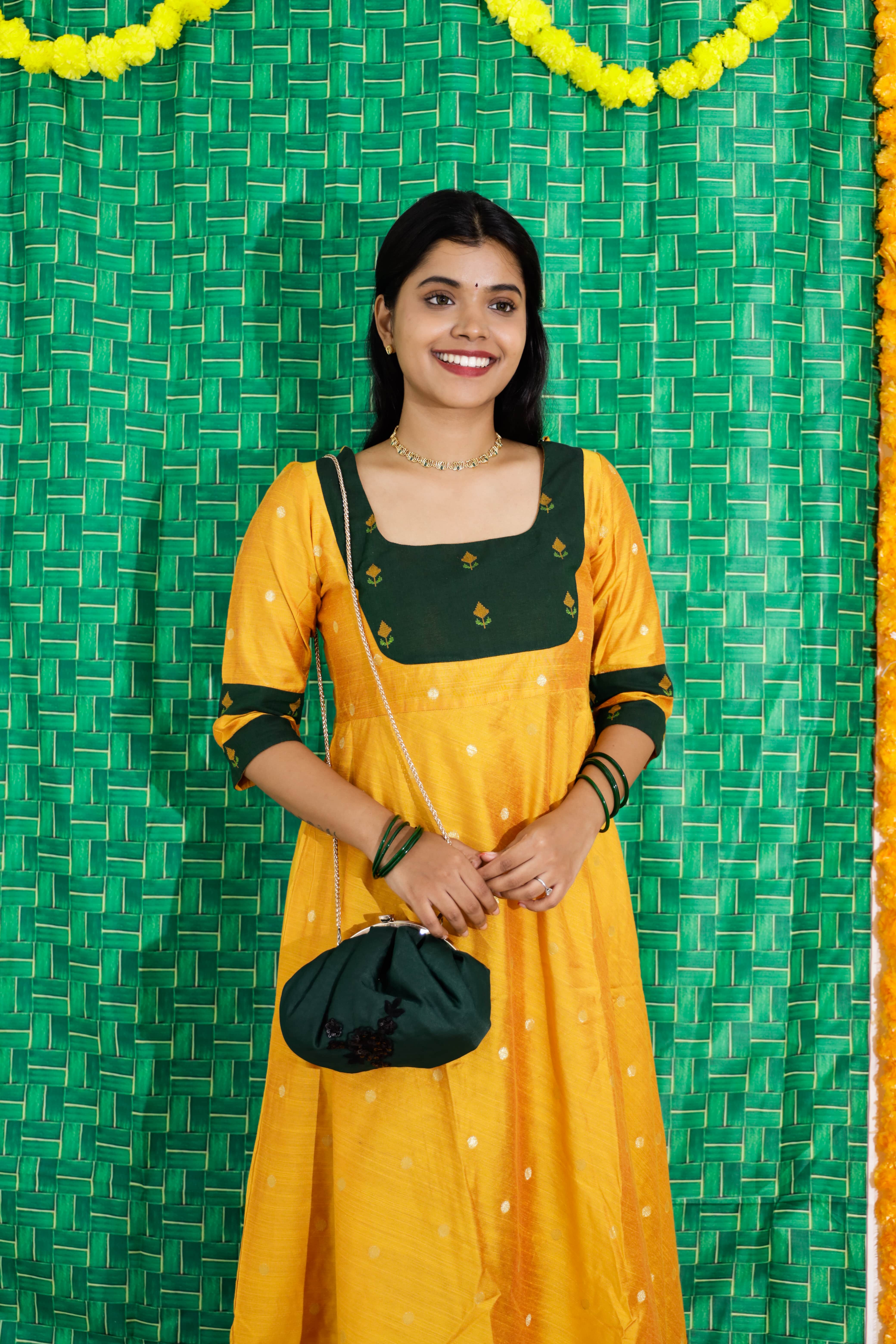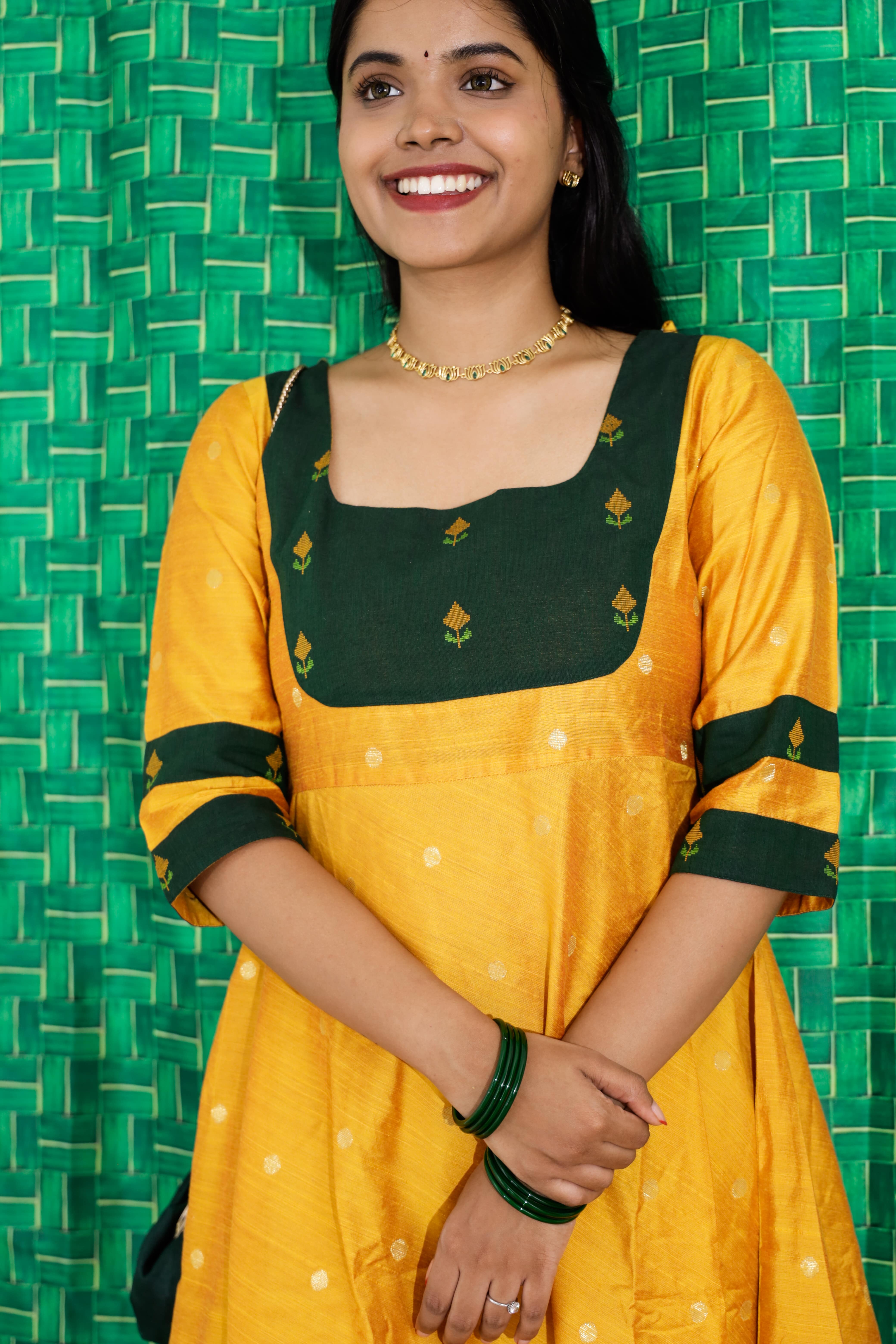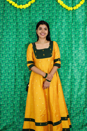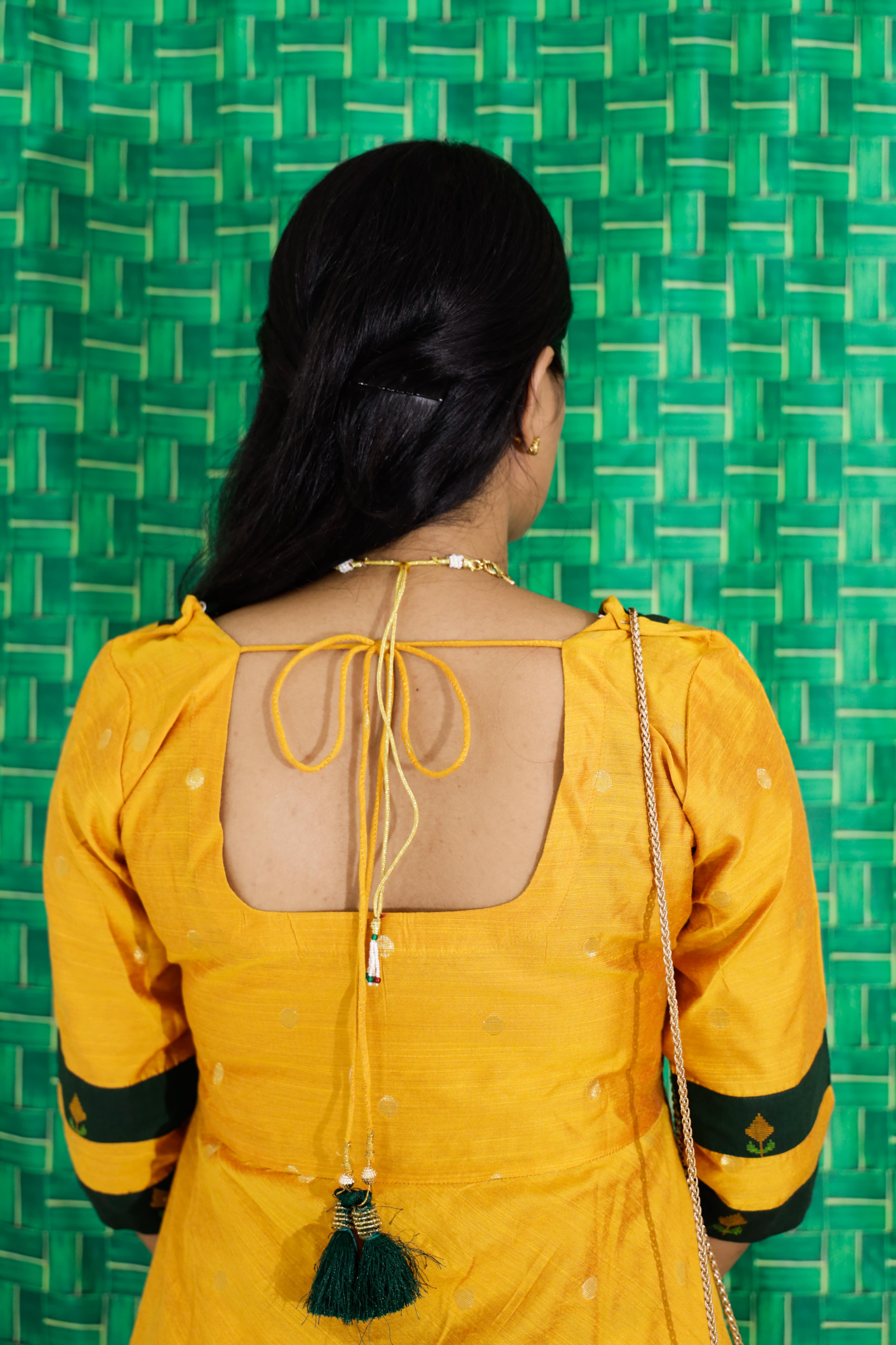 Crafted from luxurious handloom silk cotton, this entire gown exudes elegance and charm, perfect for your special occasions. The unique and custom made colour palette of this suit set, the chic neckline plus the sleeves & the breathtaking tassels for neckline at the back makes it a must-have for this festive season.