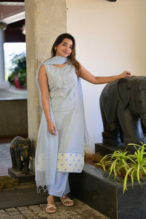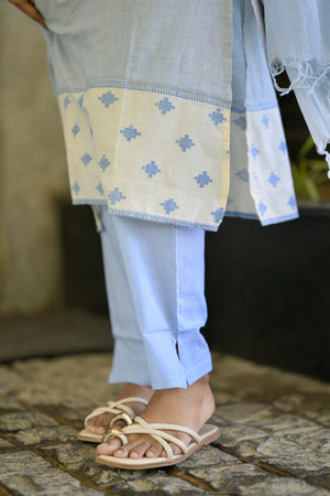 - Linen handloom cotton kurta set in blue with matching handloom cotton border with hand woven floral motifs