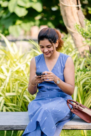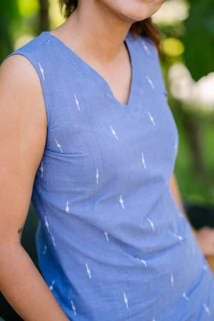 A beautiful shade of denim blue handloom cotton kurta with hand woven buttas with a smart V neck detailing. Paired with flared palazzo pants. Attached 聽(8 inch) 聽sleeves inside kurta for those who don鈥檛 prefer sleeveless.