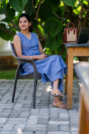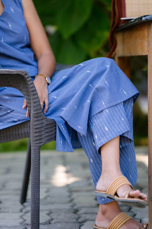 Janhavi (denim blue)- handloom cotton with hand woven buttas cotton kurta set with flared palazzo pants in denim blue