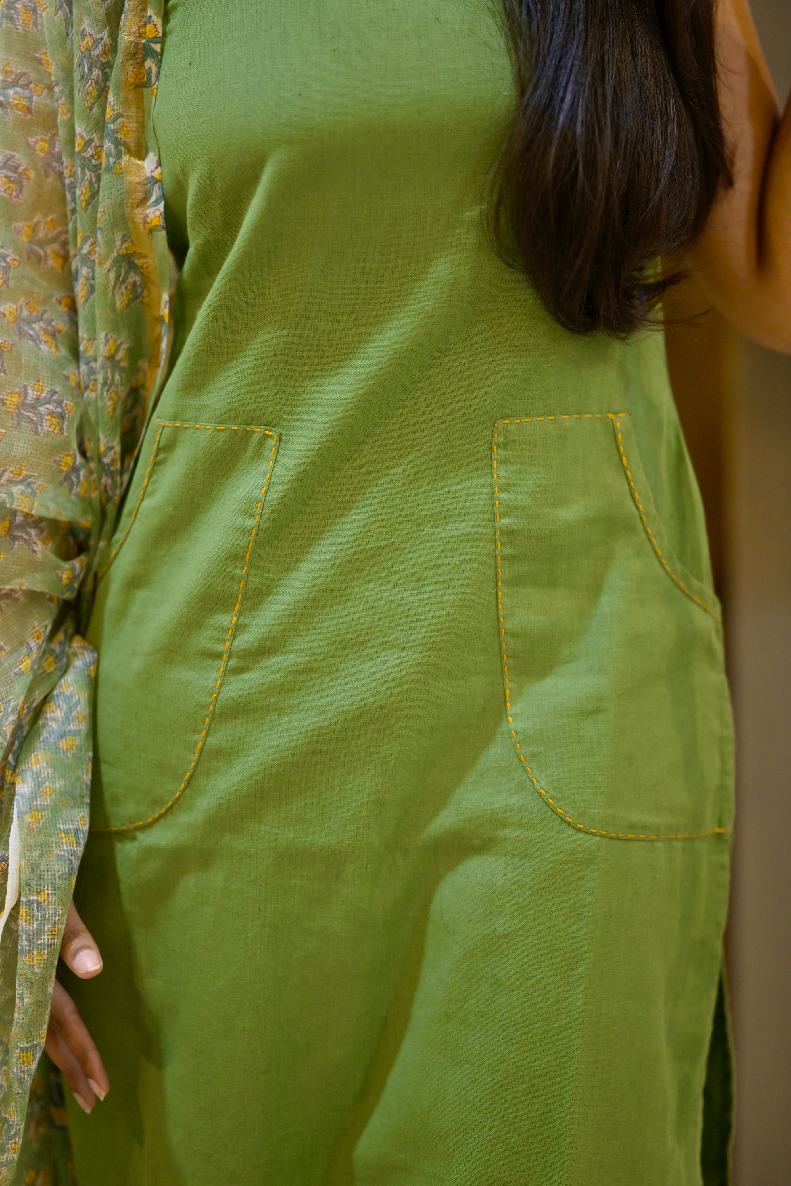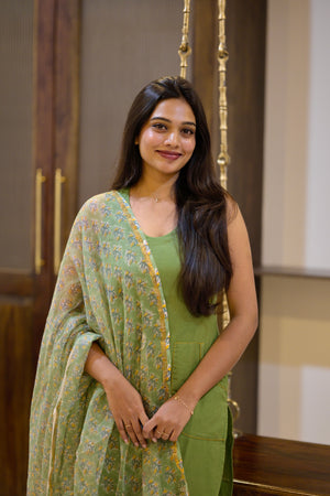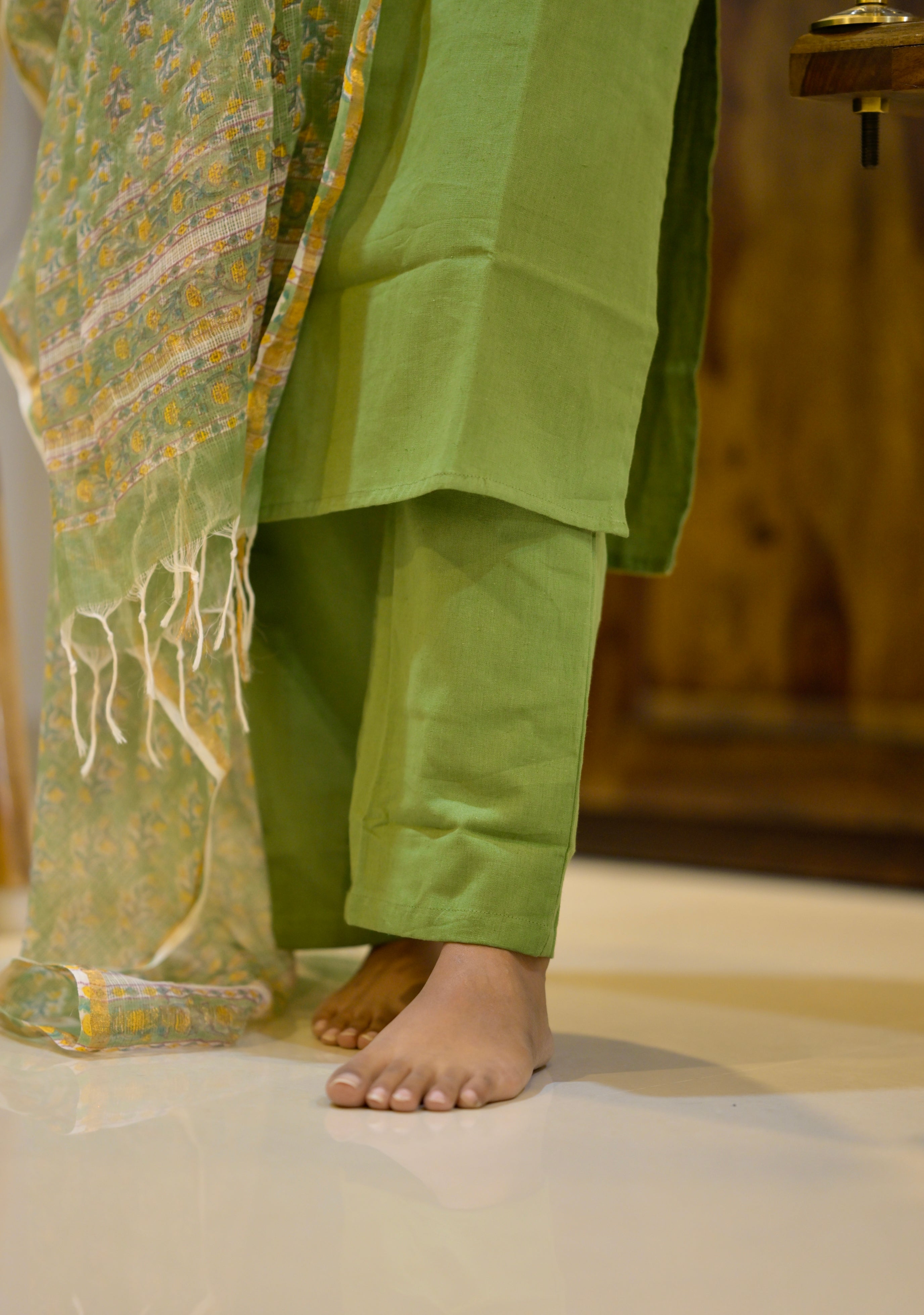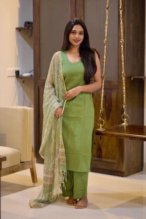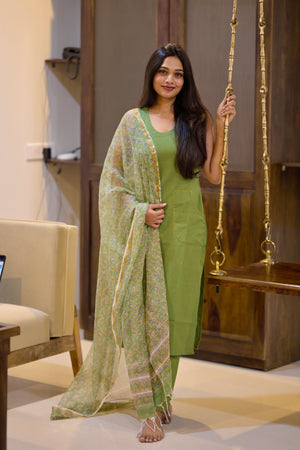 Jessie(green) - linen cotton flex kurta set in green with mughal hand block printed kota doria dupatta