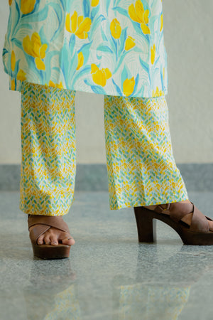 – Matching floral handblock printed organic cotton trousers with functional pcikets