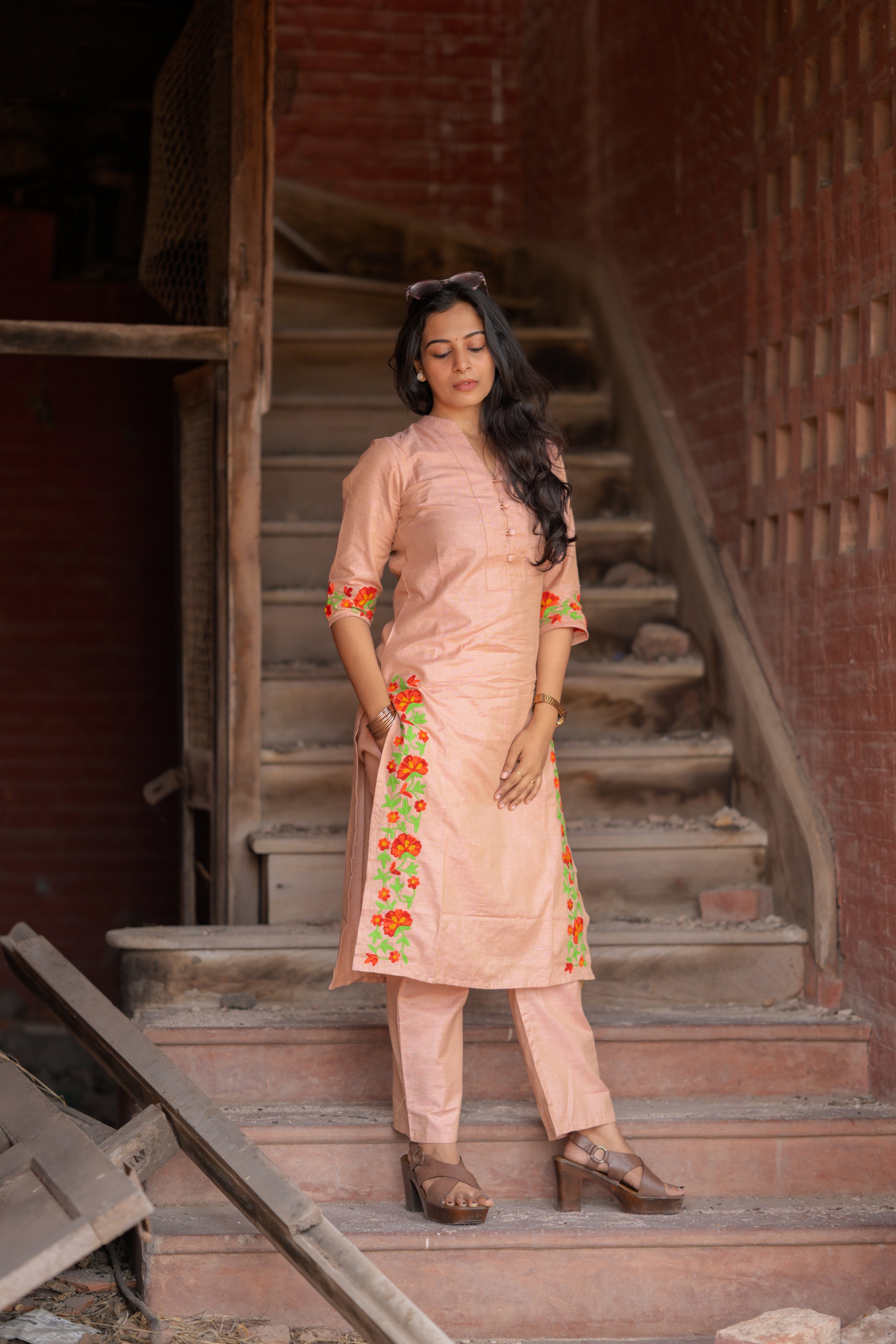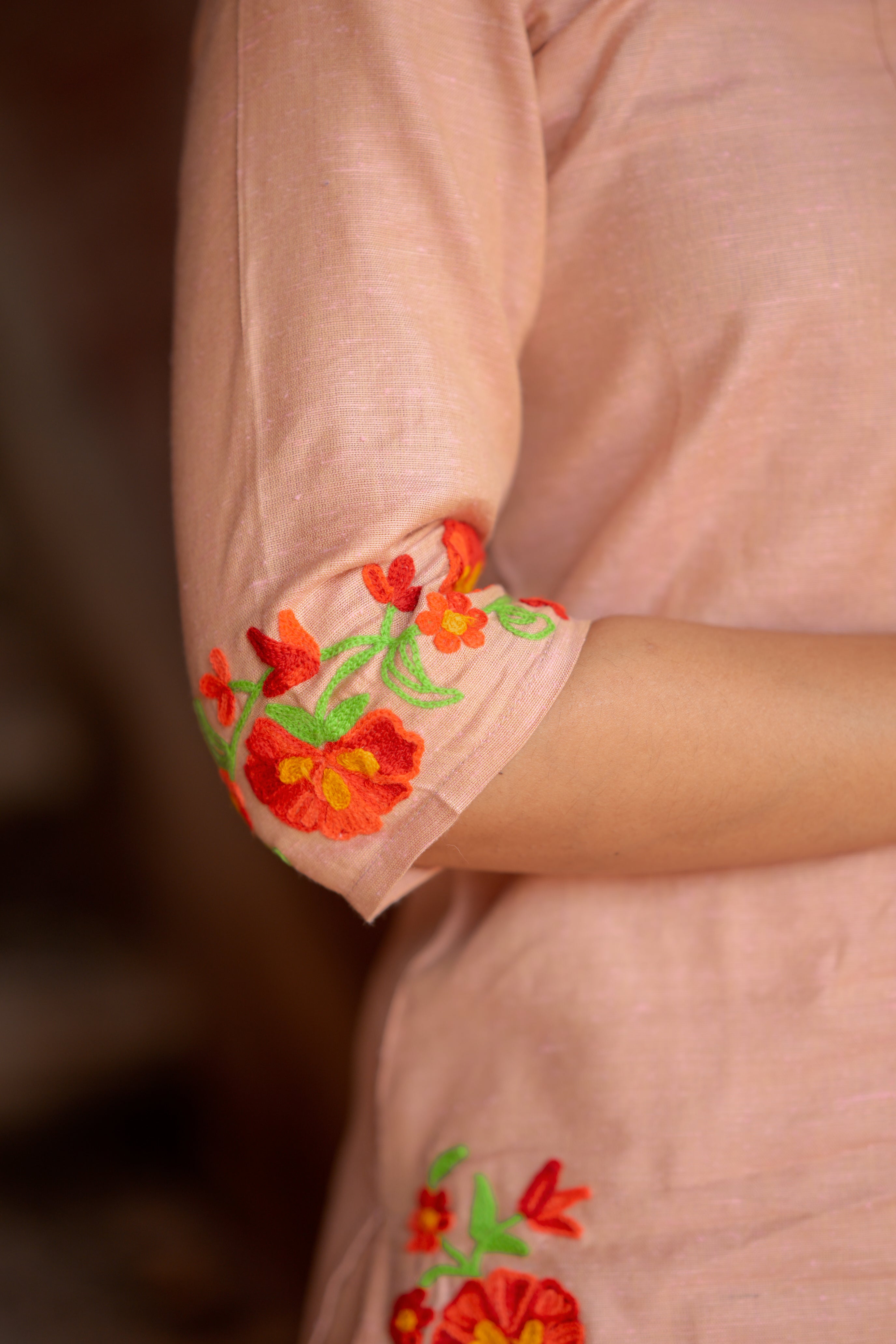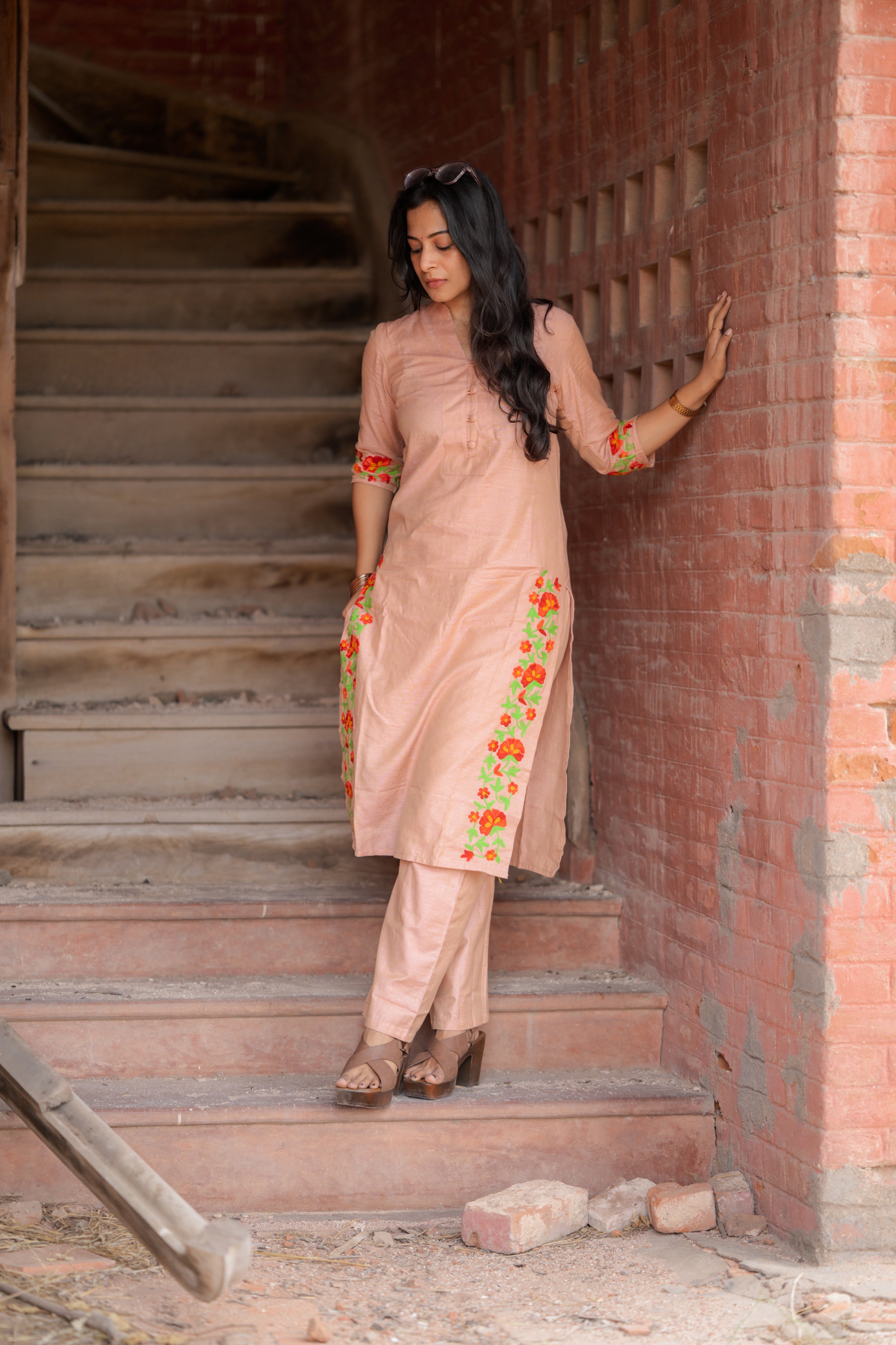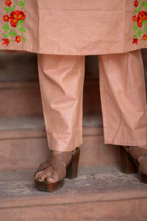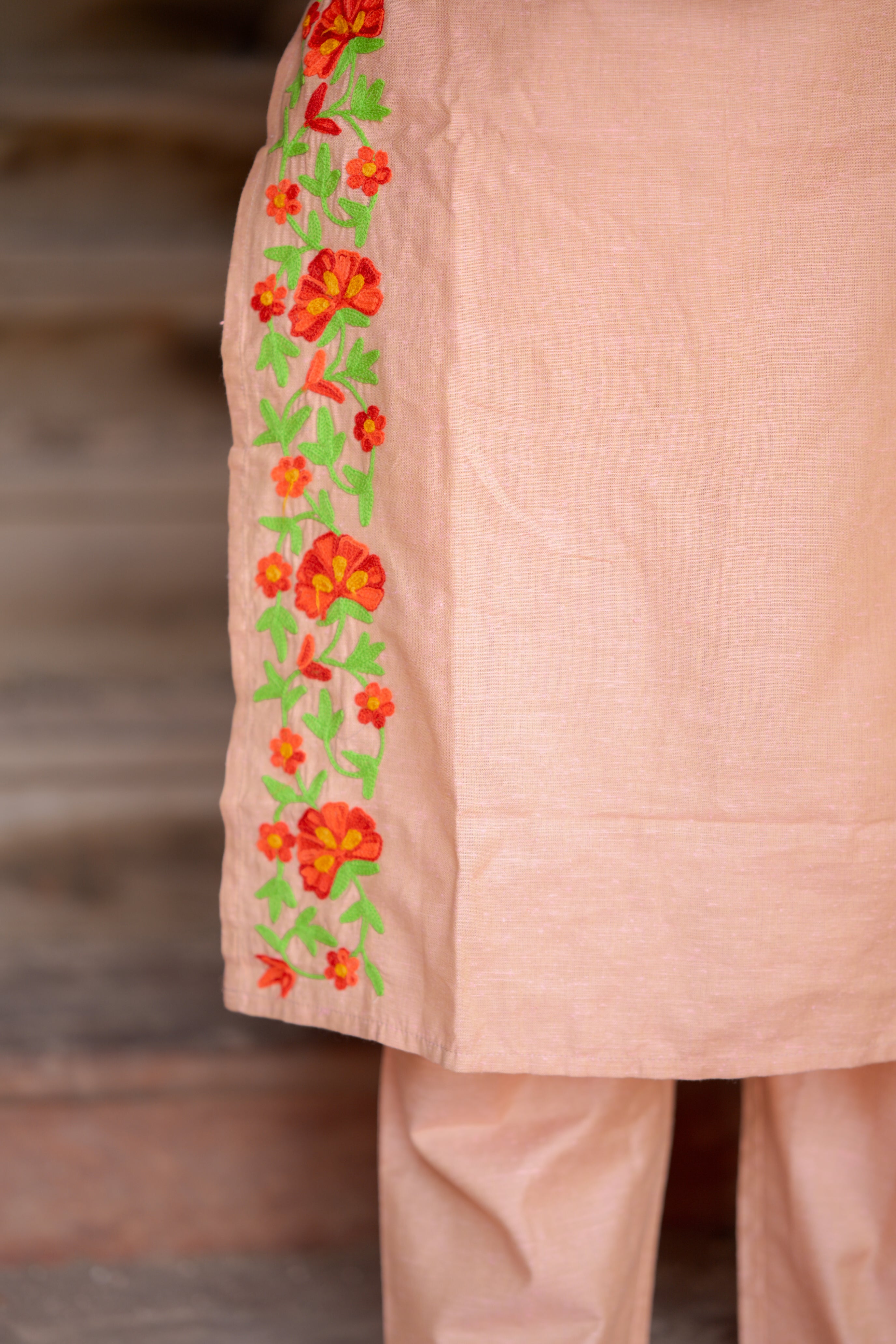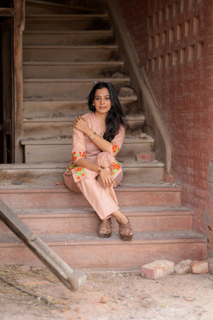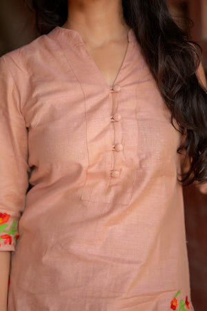 Kadhambari (peach) - khadi linen kurta set in peach with hand embroidery