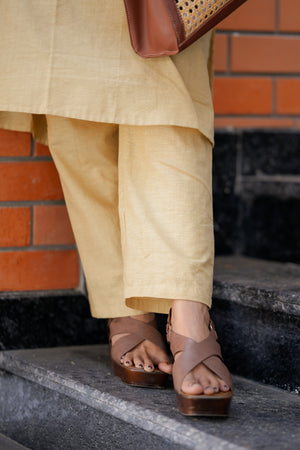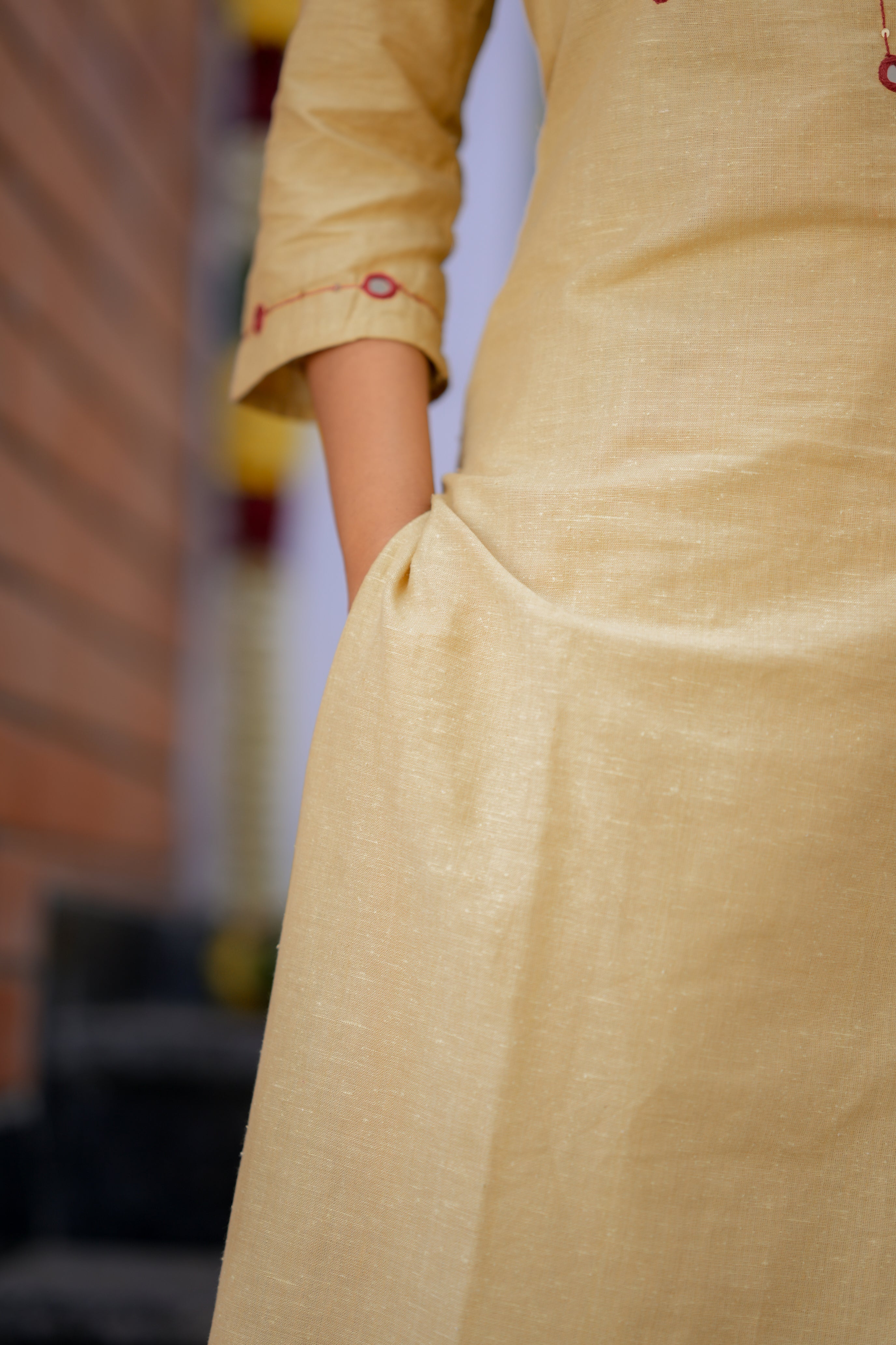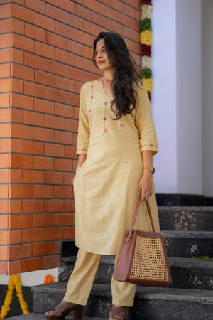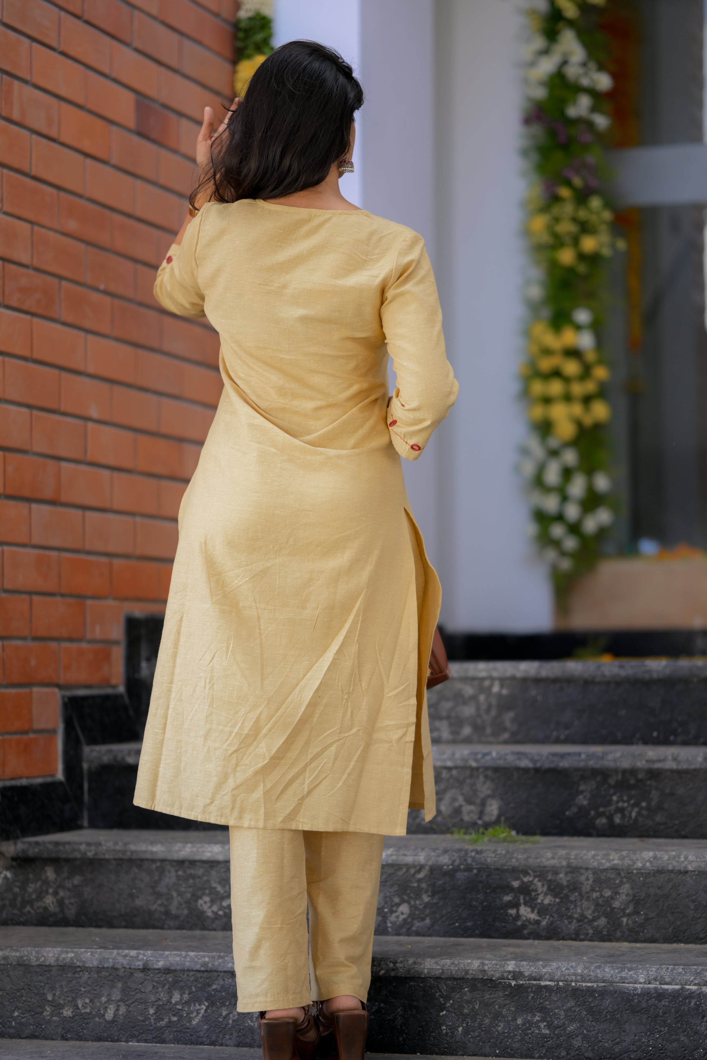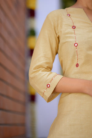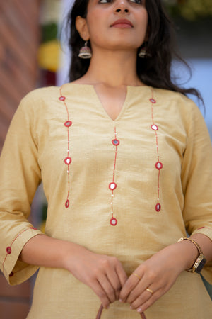 Kadhambari (yellow) - yellow khadi linen kurta set with mirror and handwork in red